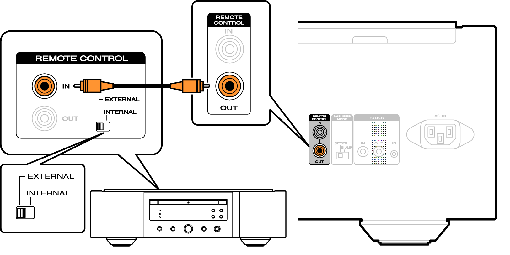 Передавать сигналы дистанционного управления можно, просто подключив аудиоустройство Marantz к разъемам REMOTE CONTROL IN/OUT с помощью прилагаемого к устройству кабеля для пульта ДУ.