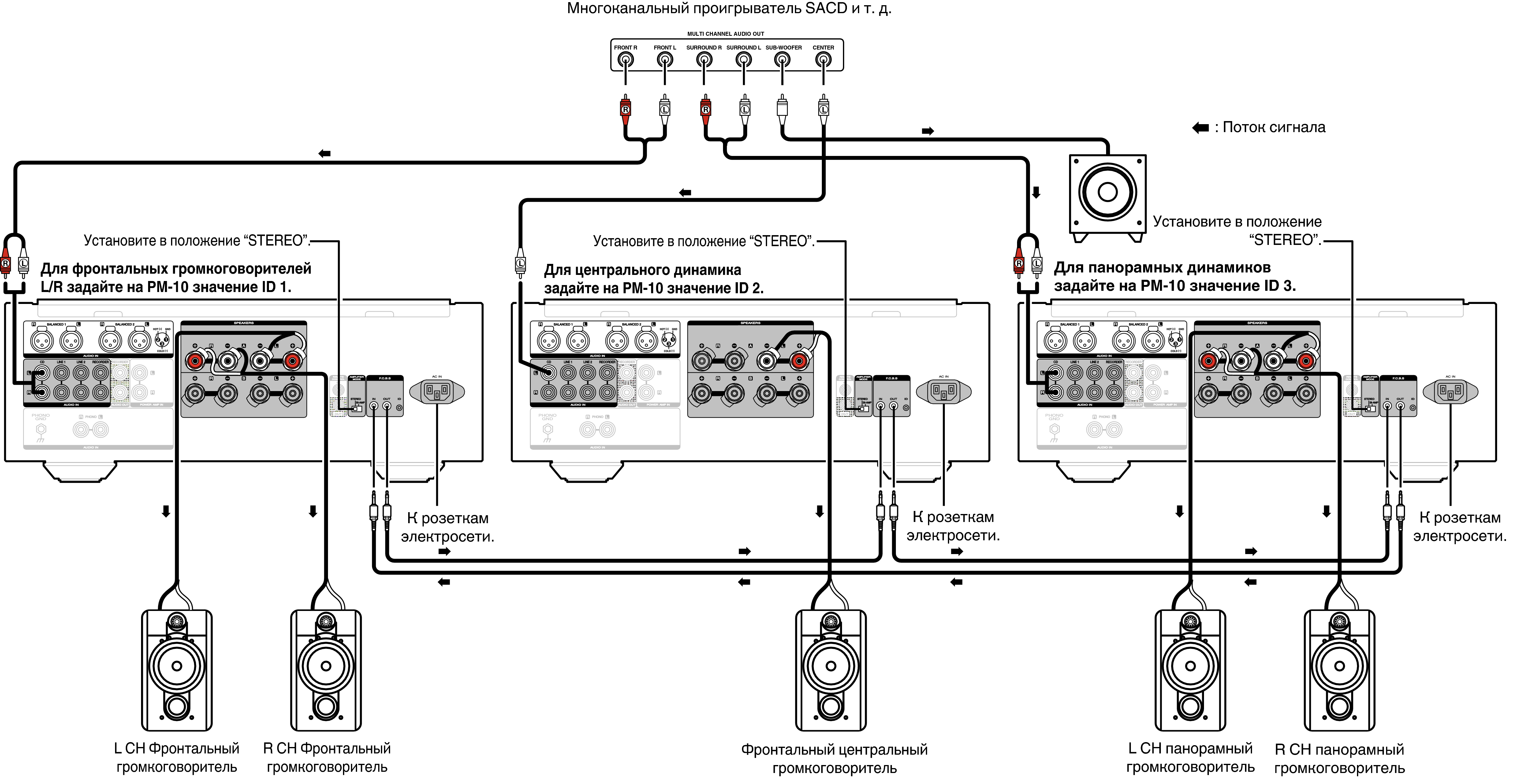 Три устройства подключены через F.C.B.S.. Для подключения по F.C.B.S подготовьте 3 соединительных аудиокабеля и обратитесь к разделу F.C.B.S..ссылка