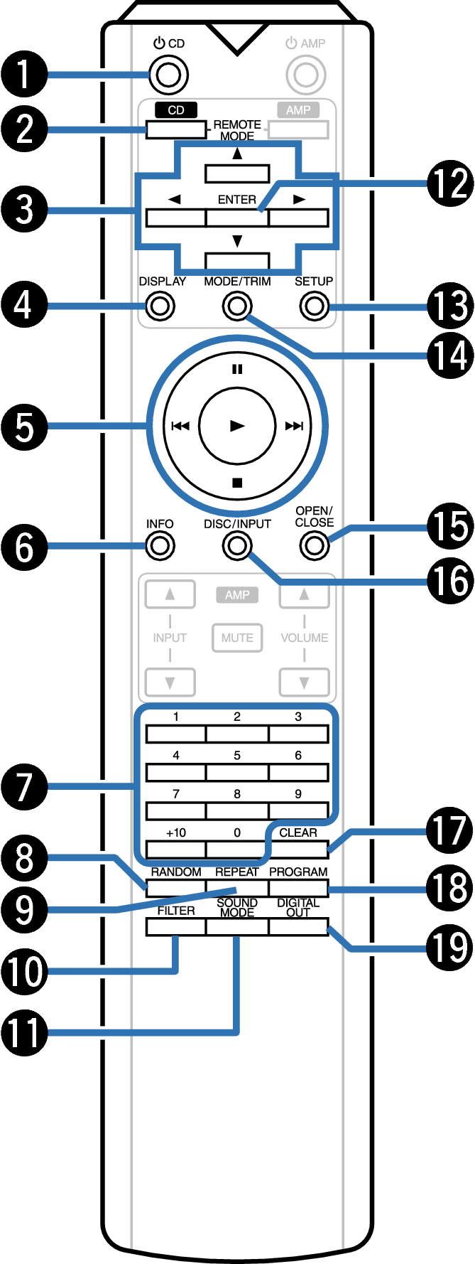 Основные операции усилителя, такие как переключение источника входного сигнала, регулирование громкости и выключение звука, возможны и при установке режима работы CD на пульте дистанционного управления.