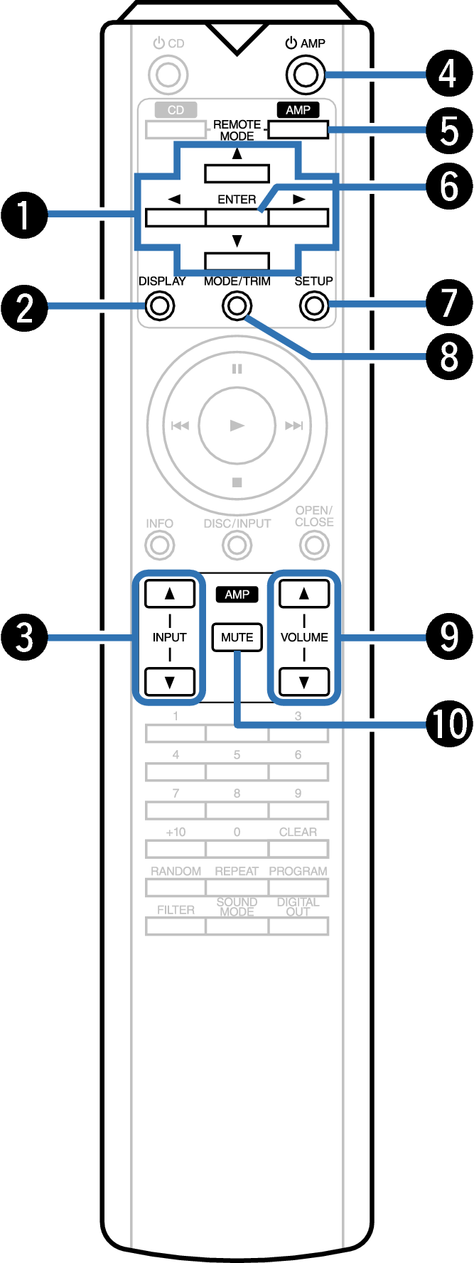 Чтобы управлять усилителем, нажмите кнопку REMOTE MODE AMP для переключения пульта дистанционного управления в режим управления усилителем.