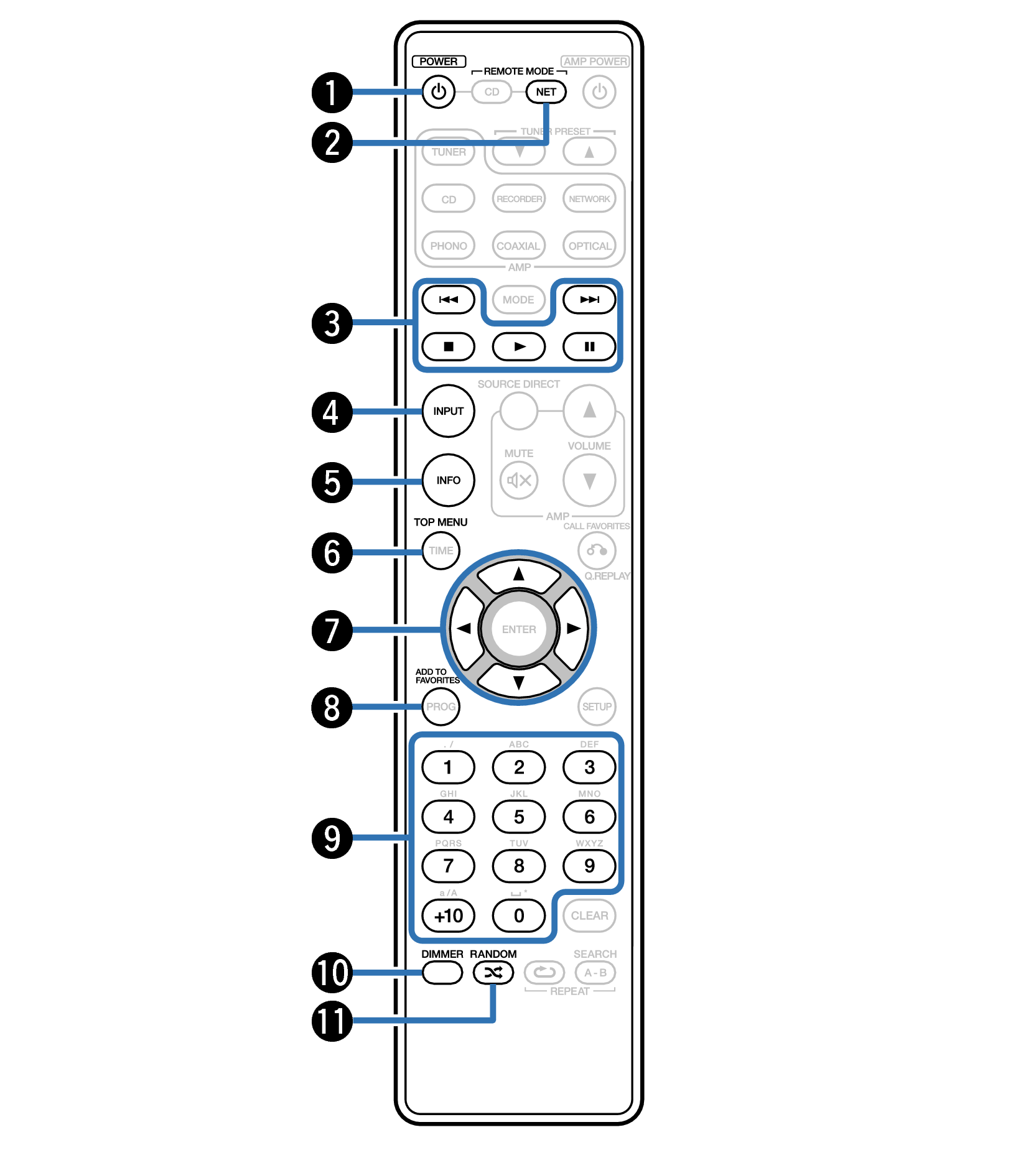 El mando a distancia incluido con esta unidad permite controlar reproductores de audio en red Marantz, además de esta unidad. Para controlar un reproductor de audio en red Marantz, pulse el botón REMOTE MODE NET para cambiar el mando a distancia al modo de funcionamiento de reproductor de audio en red.