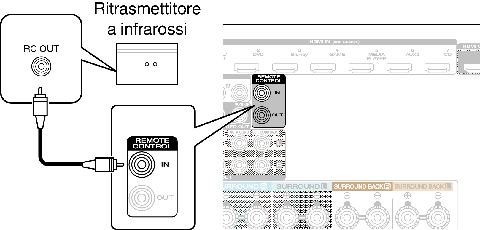 È possibile collegare un ricevitore ad infrarossi esterno ai connettori REMOTE CONTROL per eseguire operazioni su questa unità con il telecomando in dotazione senza contatto visivo. Ciò può rivelarsi utile se l’unità si trova in un armadio o in un angolo della stanza, e non è pertanto possibile dirigere il telecomando direttamente verso il dispositivo.