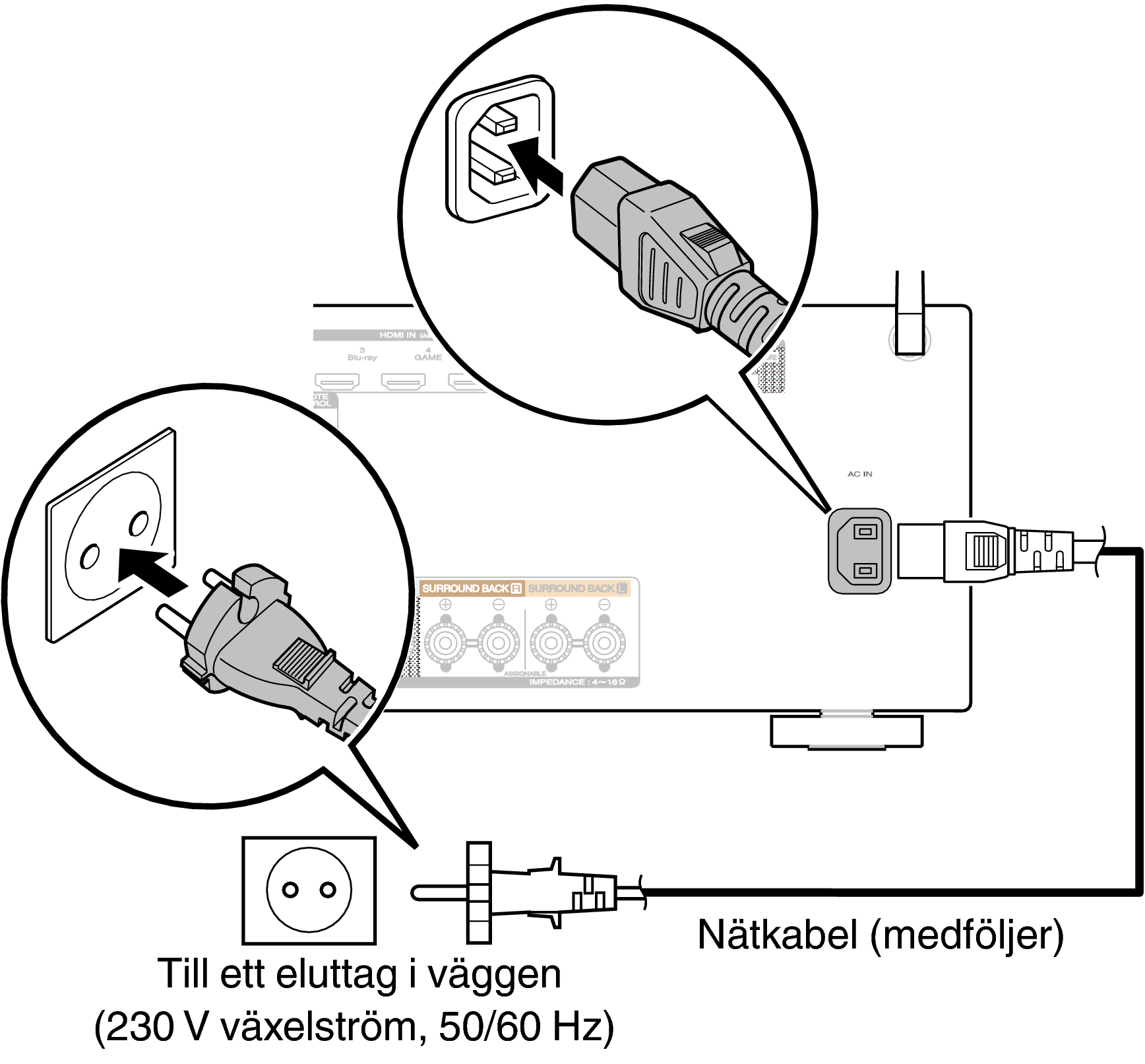 Anslut nätkabeln till ett vägguttag när alla anslutningar är klara.