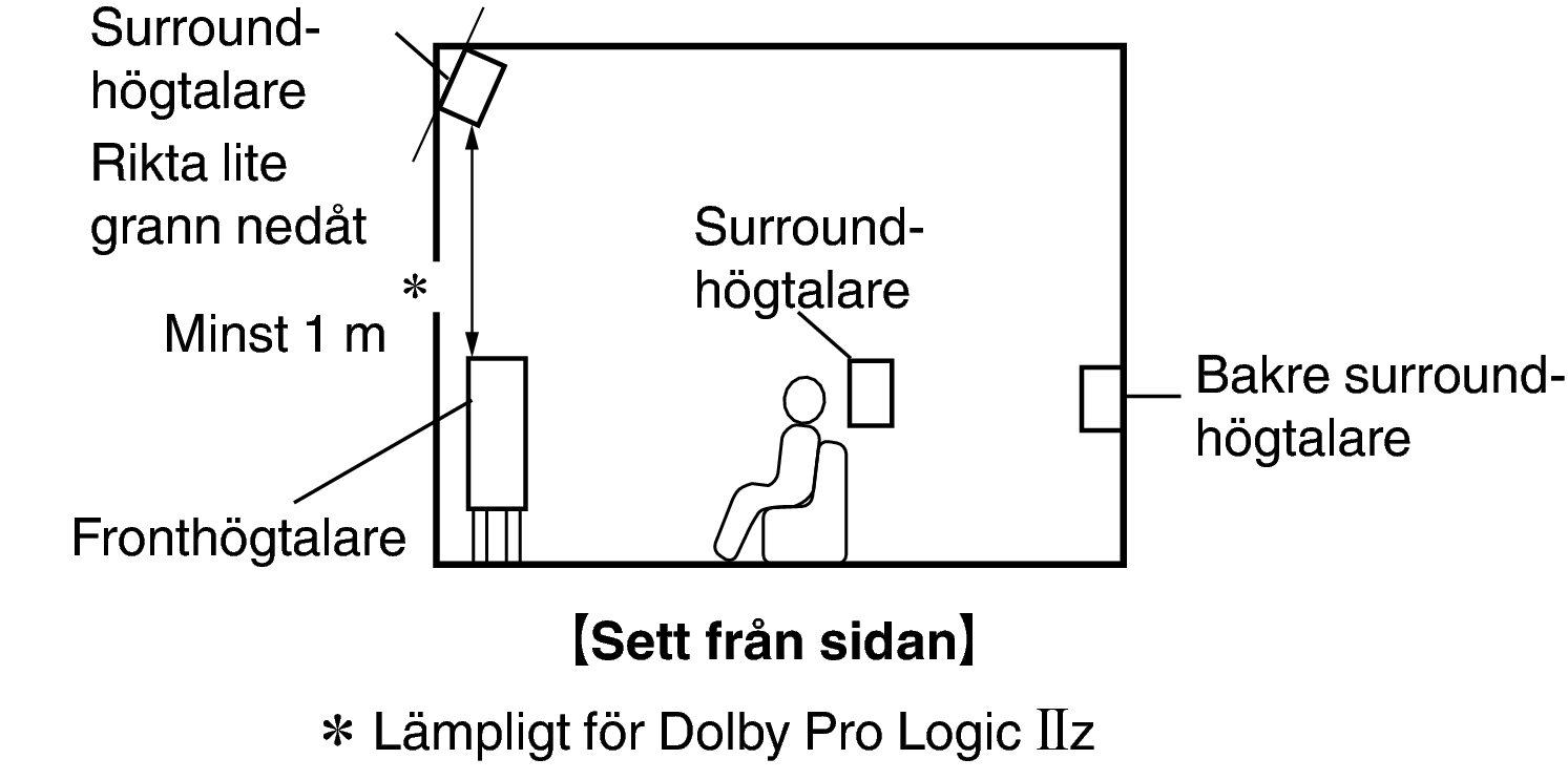 Placera vänster och höger SURROUND-högtalare på lika avstånd till vänster och höger om avlyssningspositionen. Om du inte har bakre surroundhögtalare ställer du surroundhögtalarna något bakom avlyssningspositionen. |
