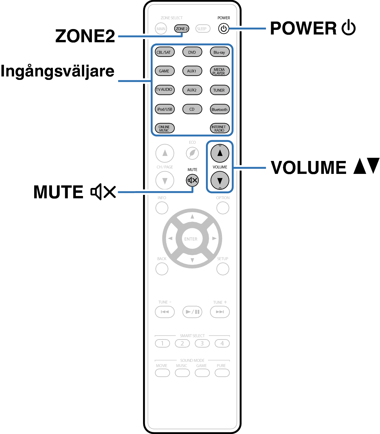 När du vill använda huvudenheten för en funktion trycker du på ZONE2 SOURCE. Du byter ingångskälla varje gång du trycker på ZONE2 SOURCE.