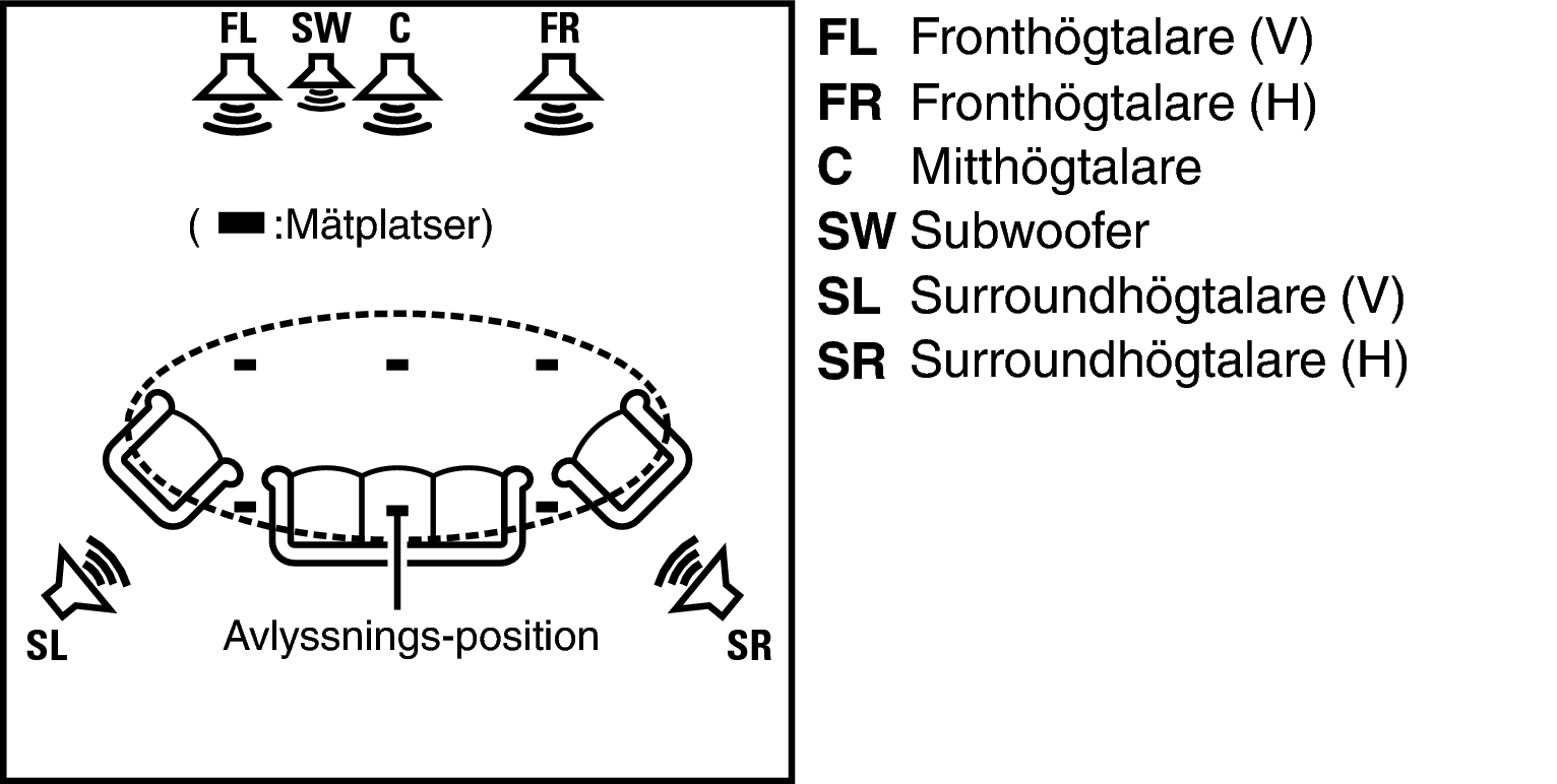 Audyssey MultEQ® XT använder mätningar från den här positionen för att räkna ut högtalaravstånd, nivå, polaritet och den optimala delningsfrekvensen för subwoofern.