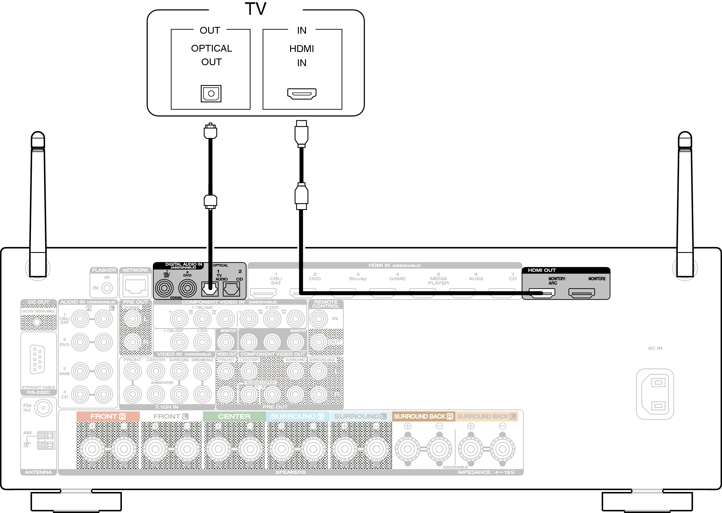 Använd en optisk kabel för att ansluta TV:n till den här enheten när du vill spela upp ljud från TV:n.