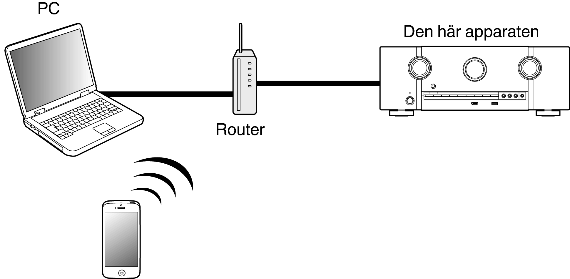Musikfiler som finns lagrade på din iPhone, iPod touch, iPad eller iTunes kan spelas upp på den här enheten via nätverket.