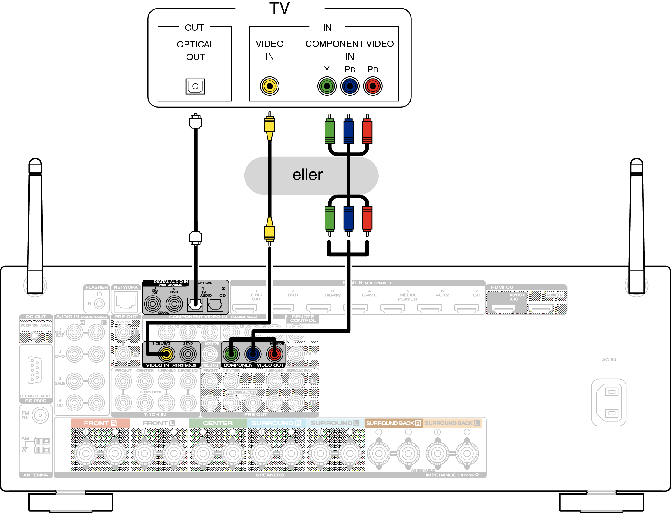 Använd en Komponentvideo- eller videokabel för att ansluta TV:n till den här enheten.