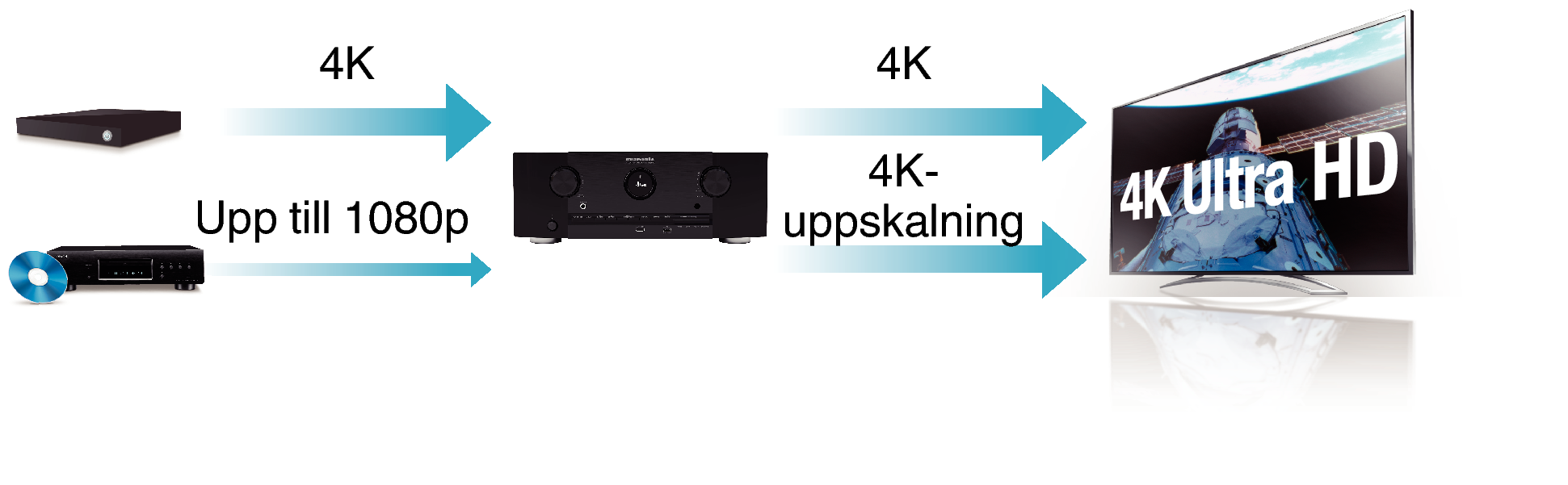 Den här enheten har en funktion för 4K-uppskalning av video som gör att analog- eller SD (Standardupplöst)-TV kan sändas via HDMI i 4K (3840 × 2160 pixlar)-upplösning. Funktionen låter enheten vara ansluten till en TV via en enda HDMI-kabel som tillåter högupplösta bilder oavsett videokälla.