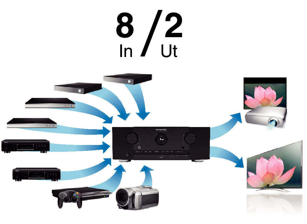 Den här enheten har 8 HDMI-ingångar och 2 HDMI-utgångar som gör att du kan ansluta HDMI-kompatibla enheter som till exempel Blu-ray-spelare, spelkonsoler och HD-videokameror. Den här enheten har 2 skärmutgångar och därmed kan du använda en projektor samtidigt som du använder den här enheten.
