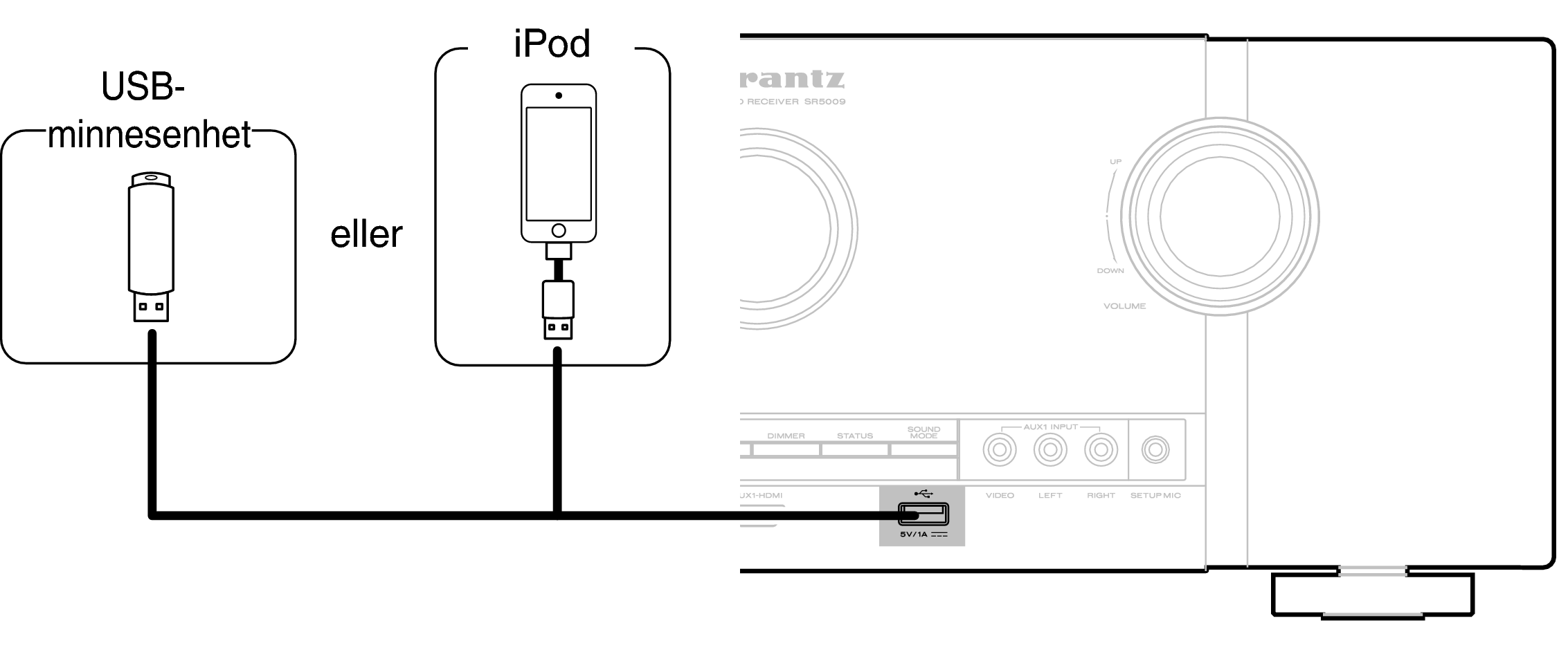 Marantz garanterar inte att alla USB-minnesenheter fungerar med eller kan strömförsörjas av denna apparat. När du använder en bärbar USB-hårddisk (HDD) som har levererats med nätadapter ska denna nätadapter användas i första hand.