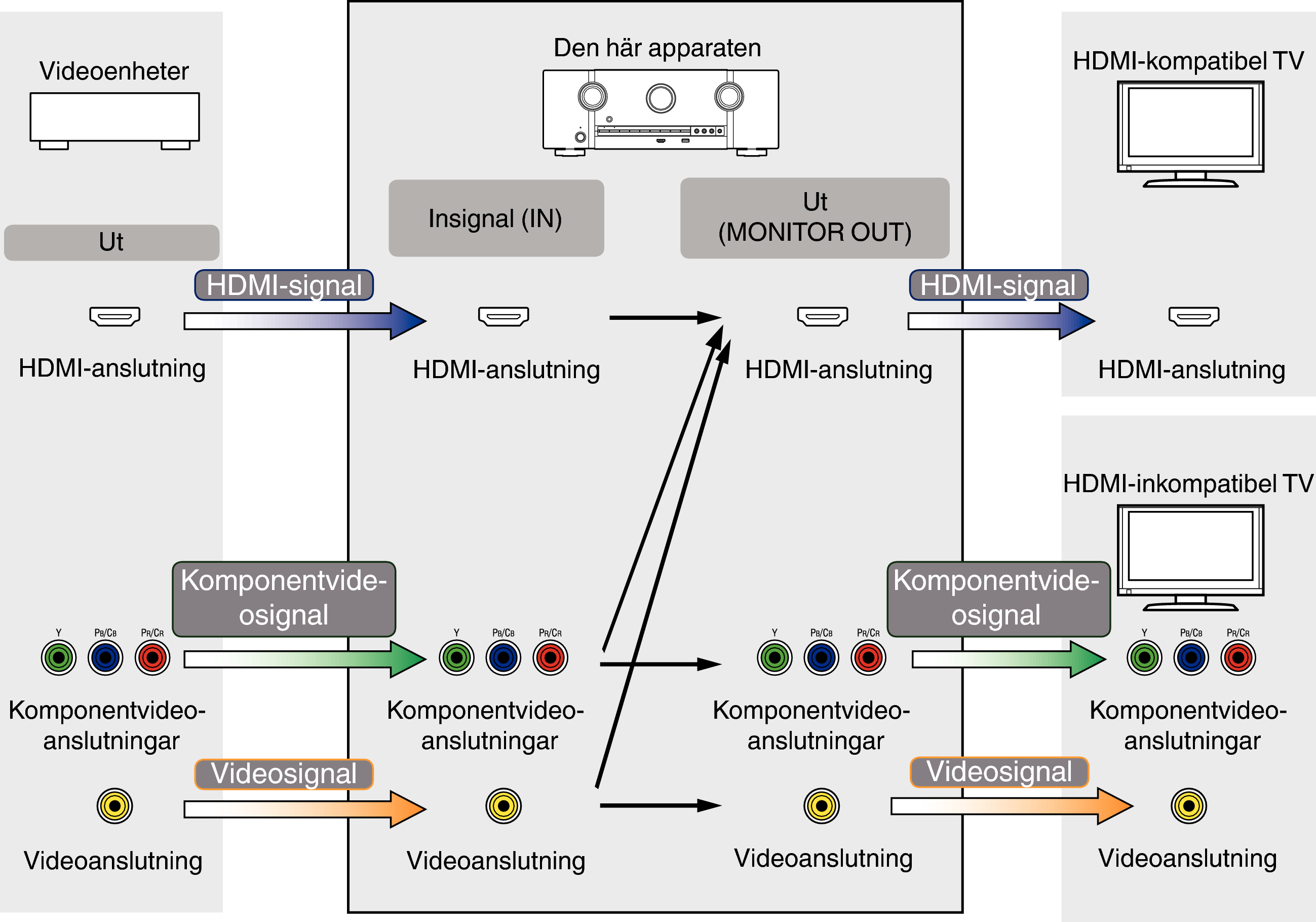 Den här enheten konverterar automatiskt inkommande videosignaler enligt nedanstående schema innan de skickas till TV:n.