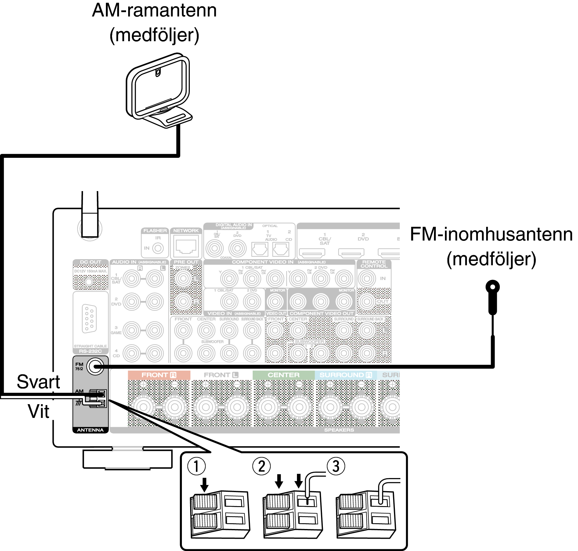 Anslut antennen, hitta en sändning och flytta sedan antennen till den plats där det är minst brus. Fäst antennen på den här platsen med tejp el. dyl.. (Lyssna på FM/AM-sändningarlänk)