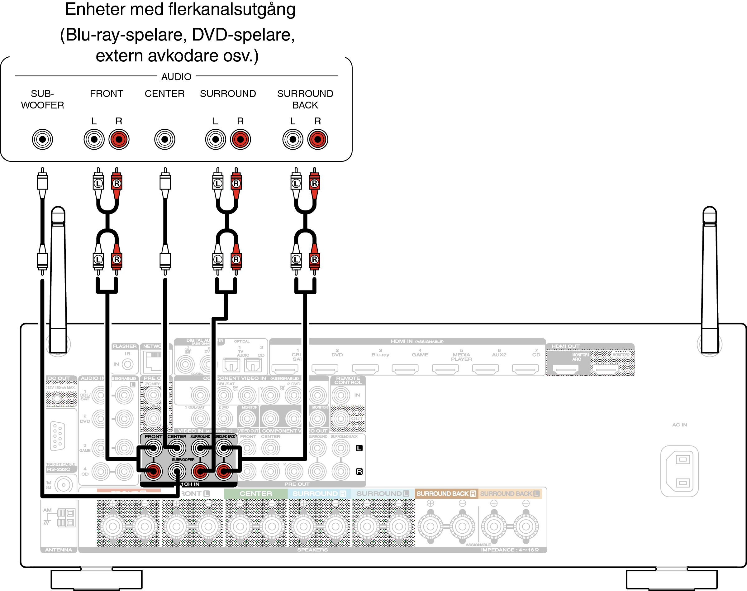 Ange Tilldelningslägelänk till “Surround bak” när du ansluter en enhet till SBL/SBR-uttaget i 7.1CH IN-ingångarna.