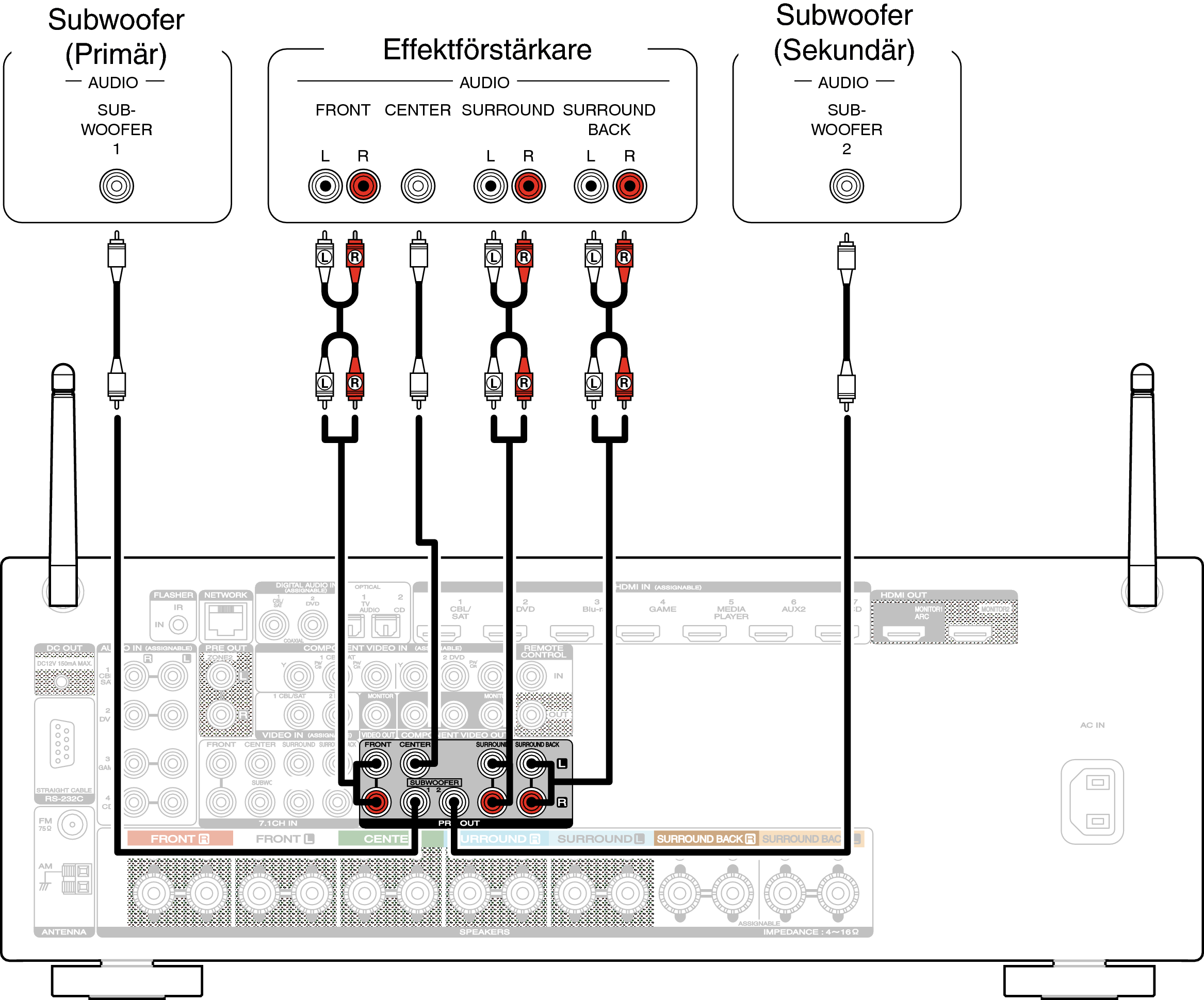 5.1-kanalig (anslutning till två förstärkare för fronthögtalare)