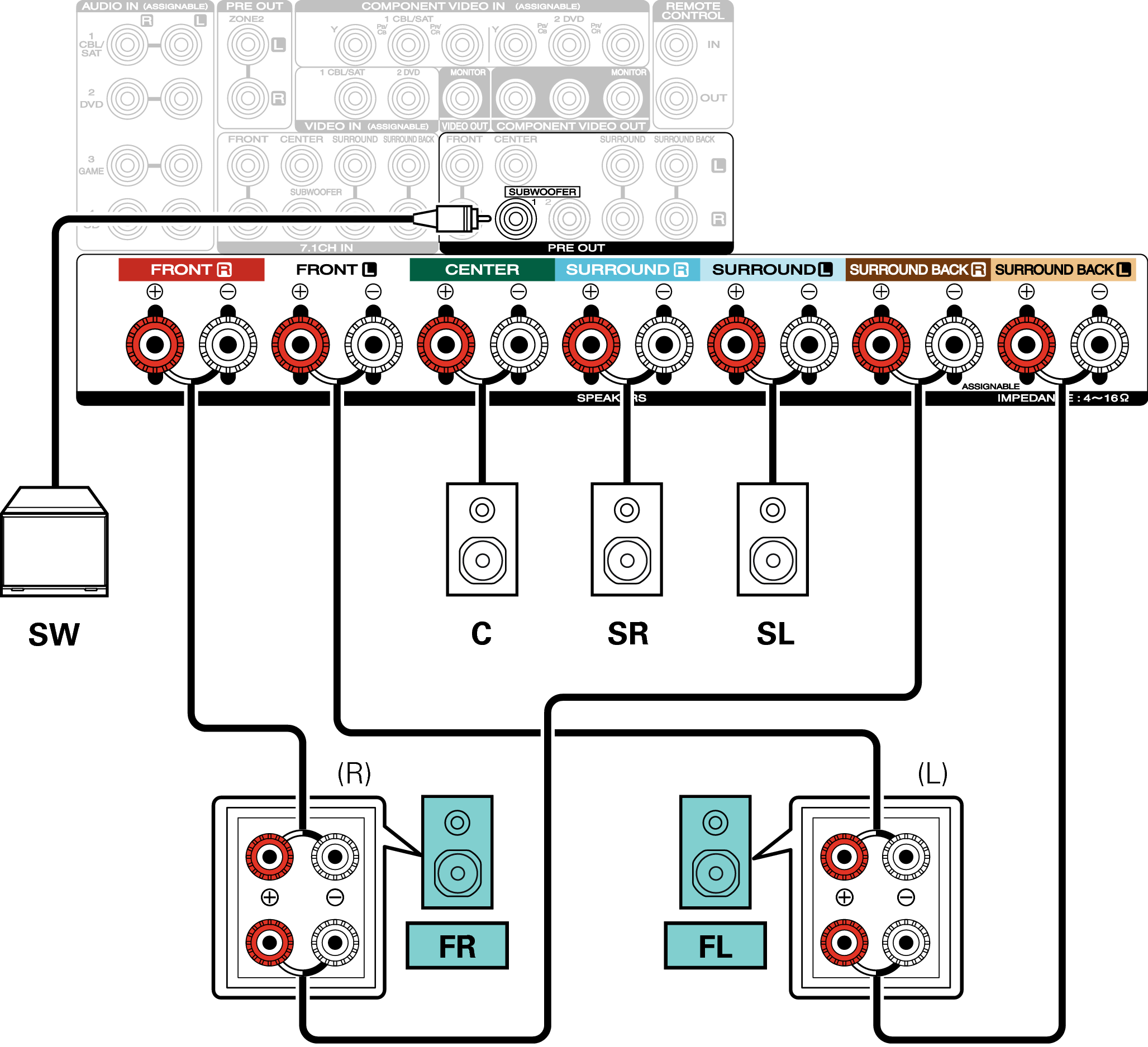 Om du använder en enda bakre surroundhögtalare ansluter du den till SURROUND BACK L-uttaget.