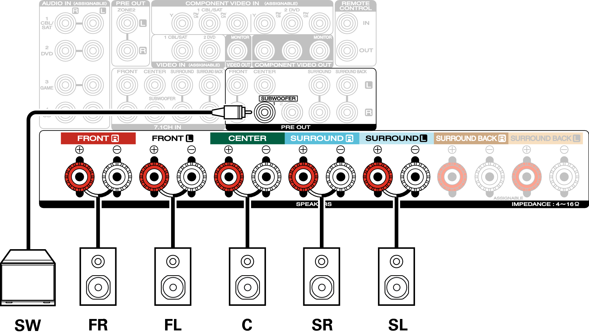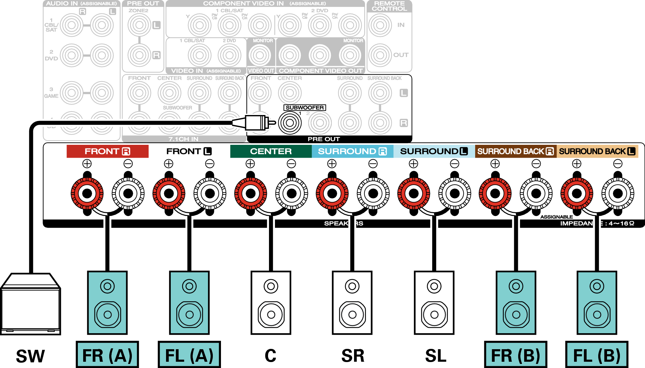 Den här anslutningsmetoden skapar ett 5.1-kanaligt högtalarsystem i MAIN ZONE och ett 2-kanaligt system i ZONE2.