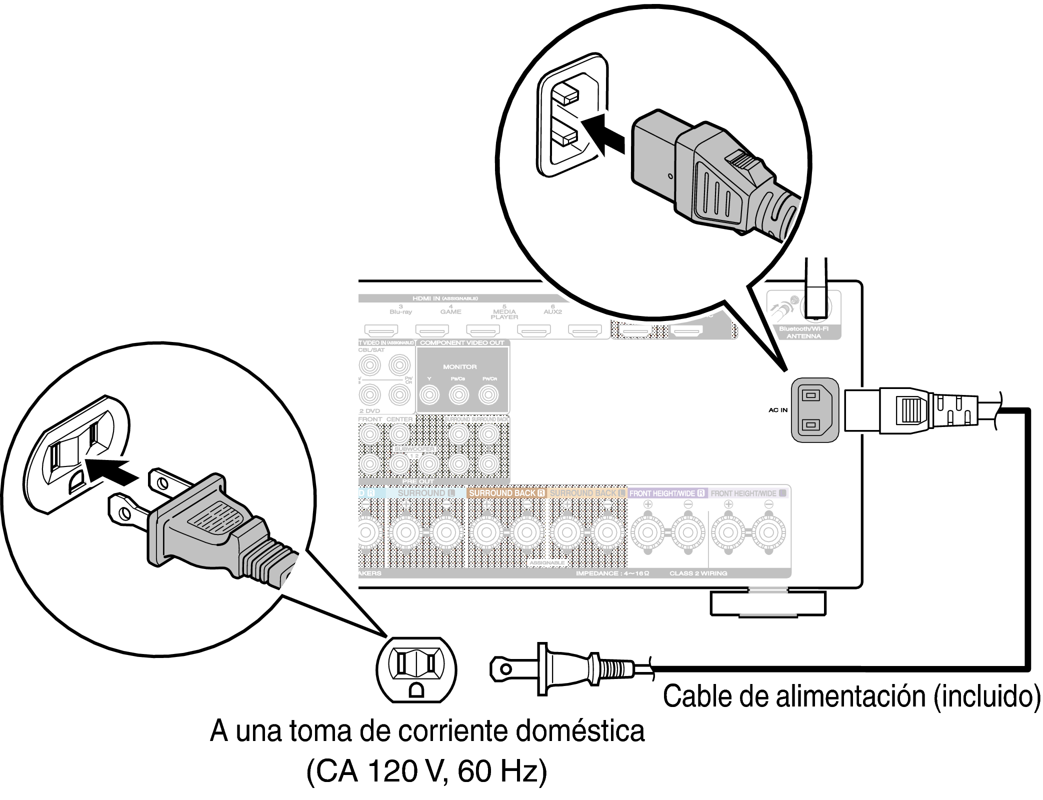 Después de completar todas las conexiones, introduzca el enchufe en la alimentación de la toma de corriente.