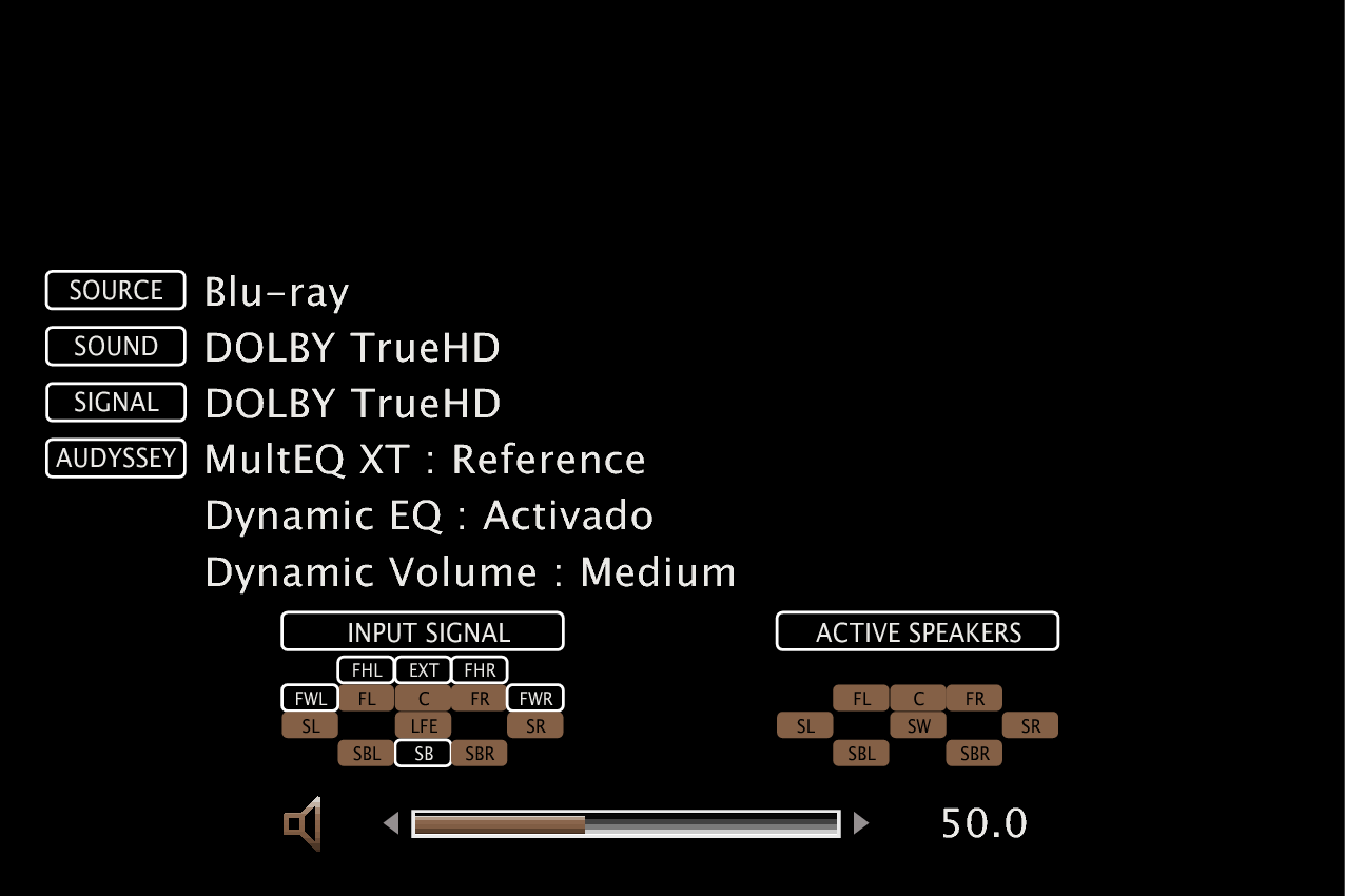 Pulse INFO en el mando a distancia para mostrar el nombre de la fuente actual, el volumen, el nombre del modo de sonido y otra información en la parte inferior de la pantalla.