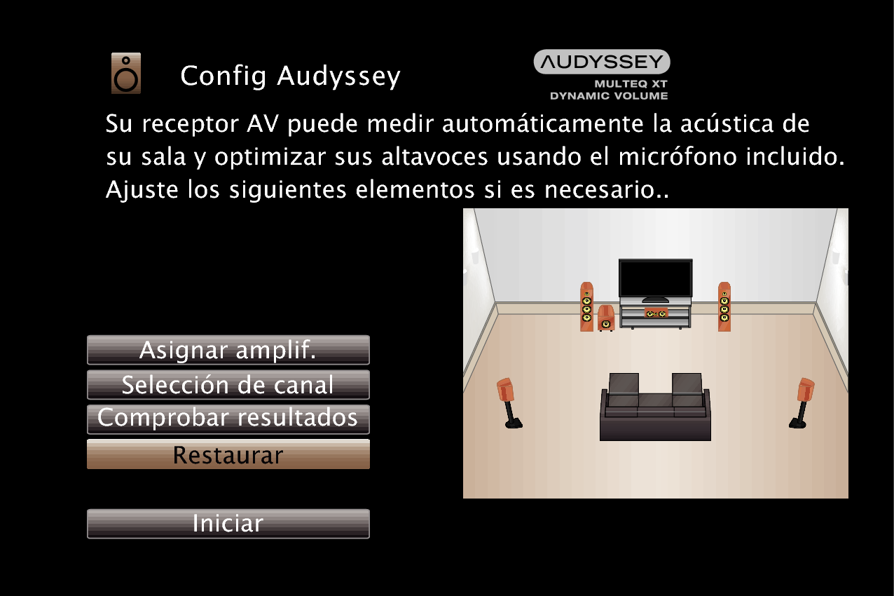Si configura “Restaurar” como “Restaurar”, puede volver al resultado de la medición de “Config Audyssey®” (valor calculado al principio por MultEQ® XT) incluso cuando haya cambiado cada ajuste manualmente.