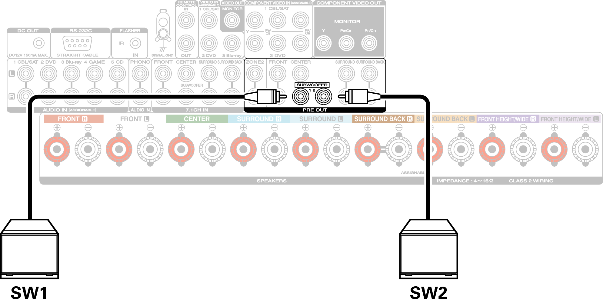 Utilice un cable para subwoofer para conectarlo. Esta unidad admite la conexión de dos subwoofers.
