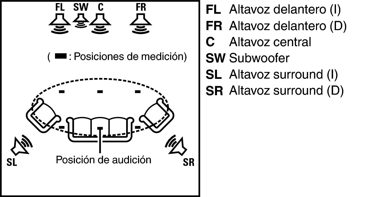 Para realizar la medición, coloque el micrófono de calibración de sonido en distintos puntos del área de audición. Para obtener los mejores resultados posibles, se recomienda realizar las mediciones en seis o más posiciones como se indica en la ilustración (hasta ocho posiciones).