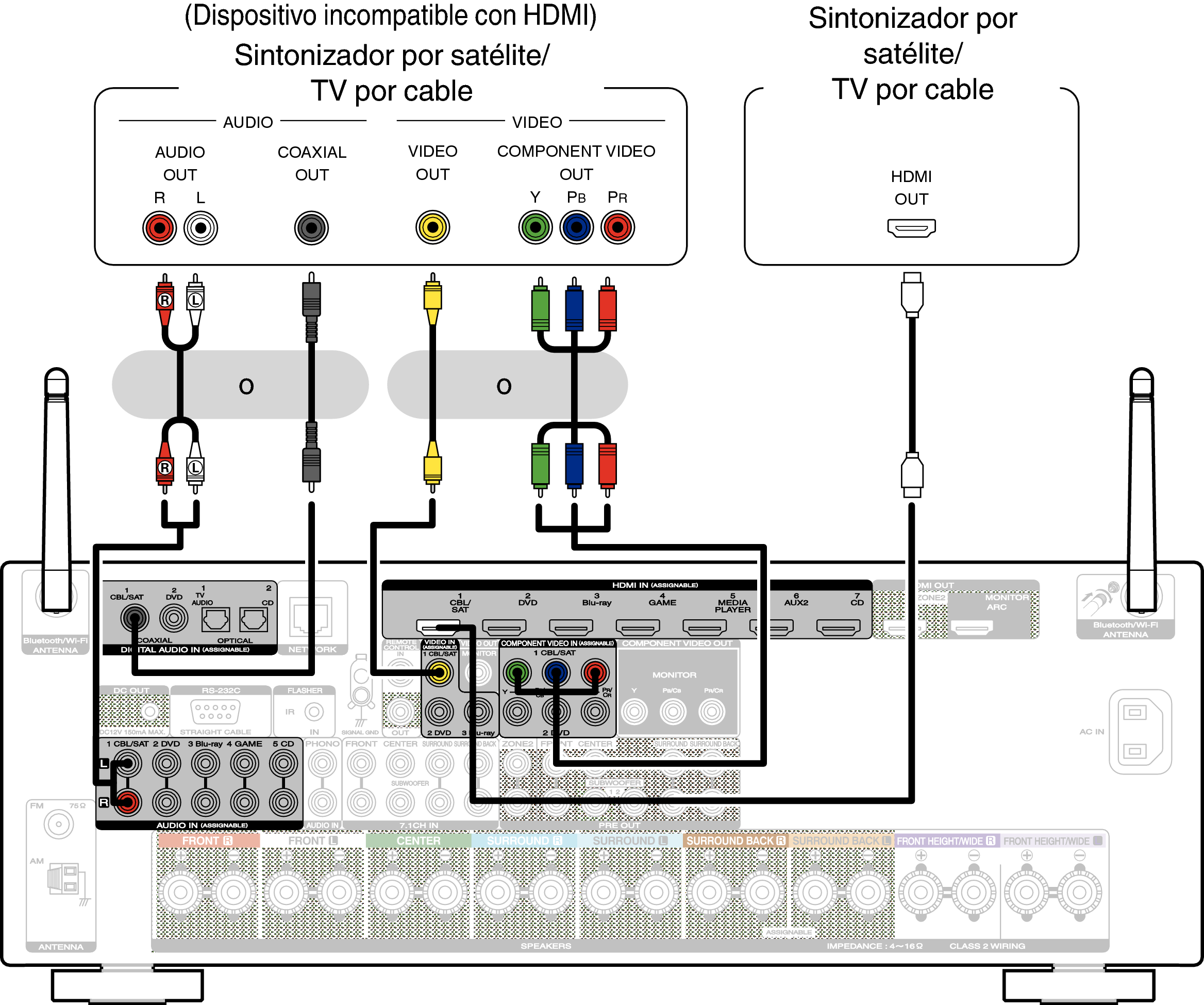 En esta explicación se incluye la conexión con un sintonizador de TV por satelite/por cable como ejemplo.
