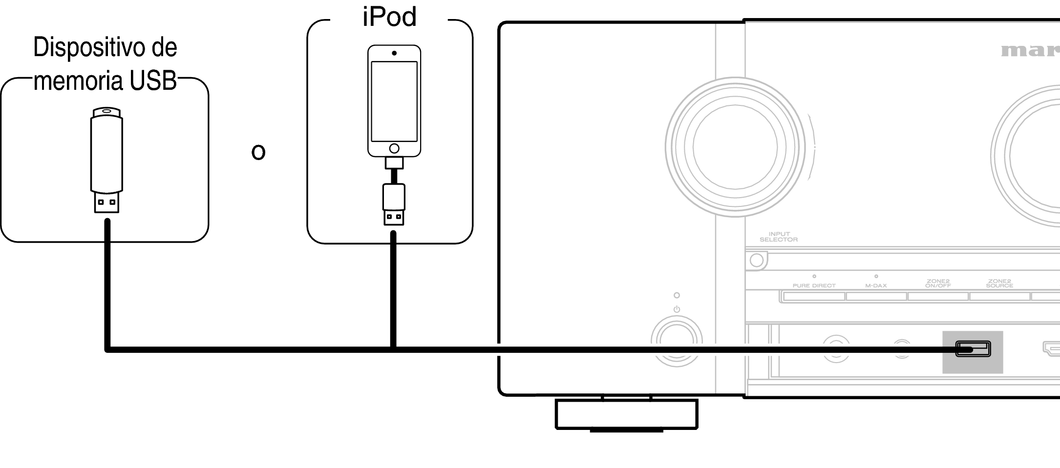 Consulte las instrucciones de funcionamiento en “Reproducción desde un iPod” enlace o “Reproducción desde un dispositivo de memoria USB” enlace.