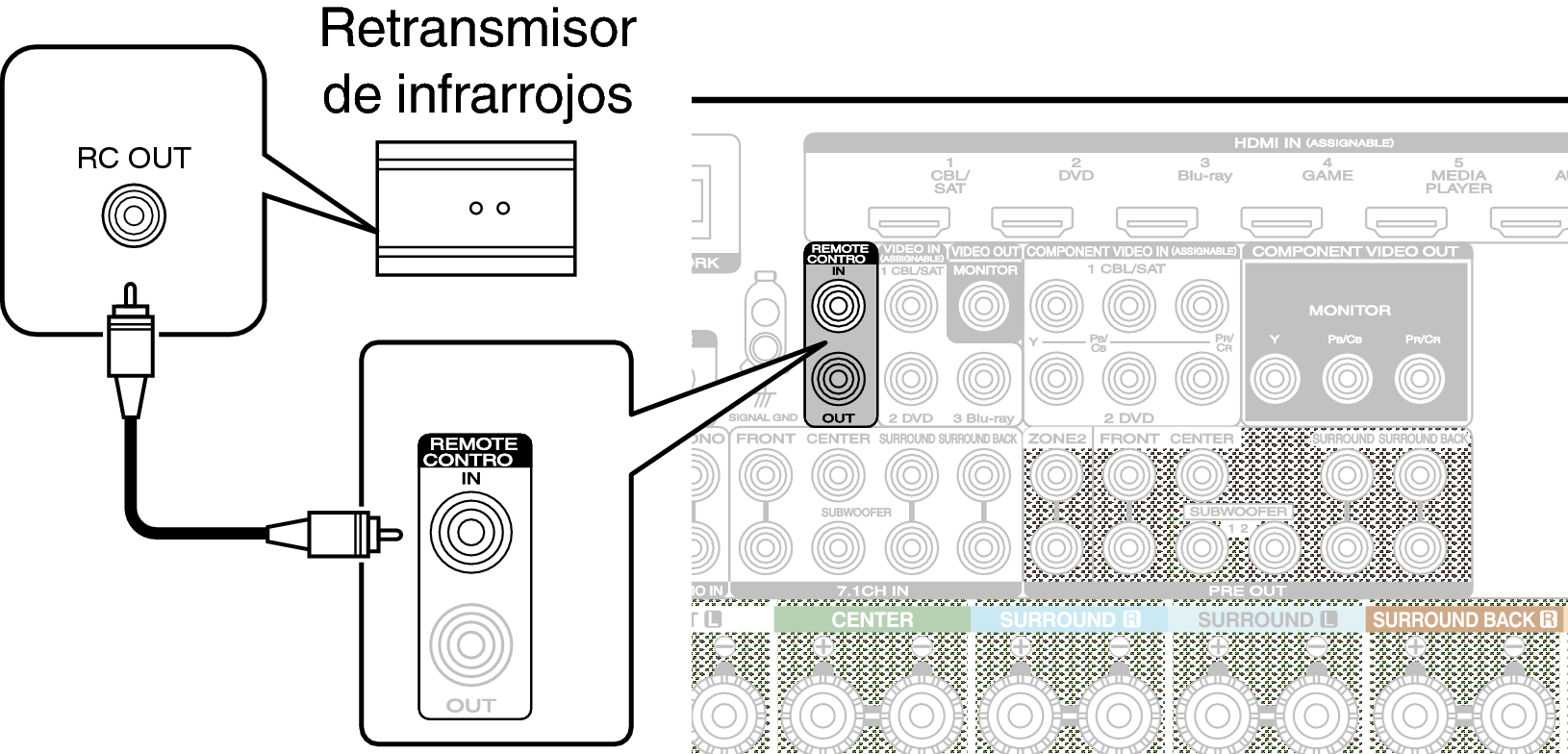 Puede conectar un receptor infrarrojos externo a los conectores REMOTE CONTROL para realizar operaciones en esta unidad con el mando a distancia proporcionado sin tener contacto visual. Esto puede ser necesario si la unidad está oculta en un mueble o una esquina, de modo que no pueda apuntar directamente con el mando a distancia al dispositivo.