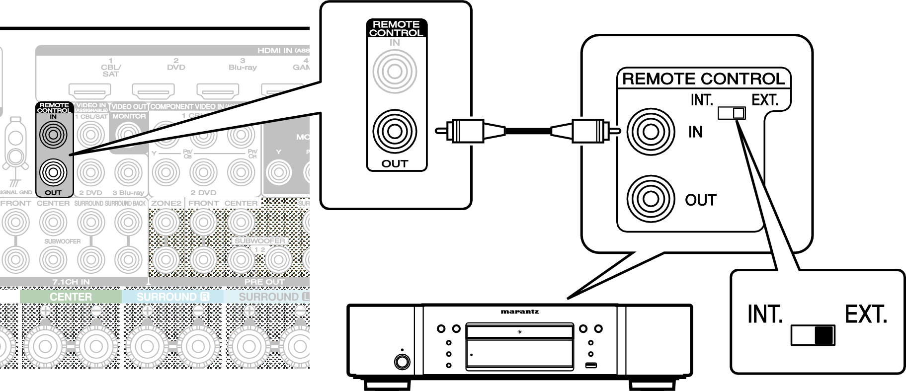 Si utiliza un dispositivo Marantz que no sea esta unidad que admita la conexión remota, puede transmitir señales del mando a distancia con solo conectar el dispositivo al conector REMOTE CONTROL IN/OUT con un cable monoaural.