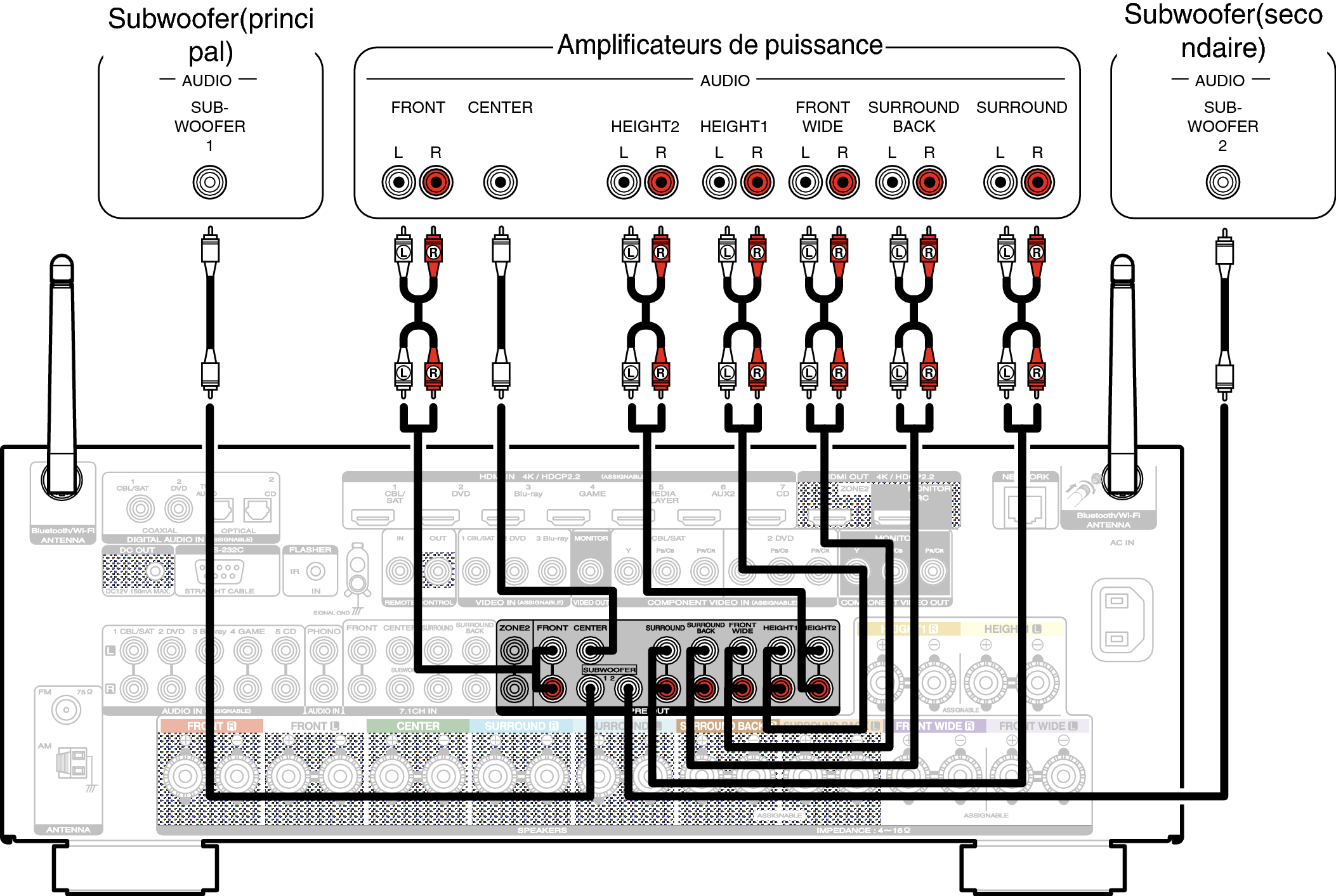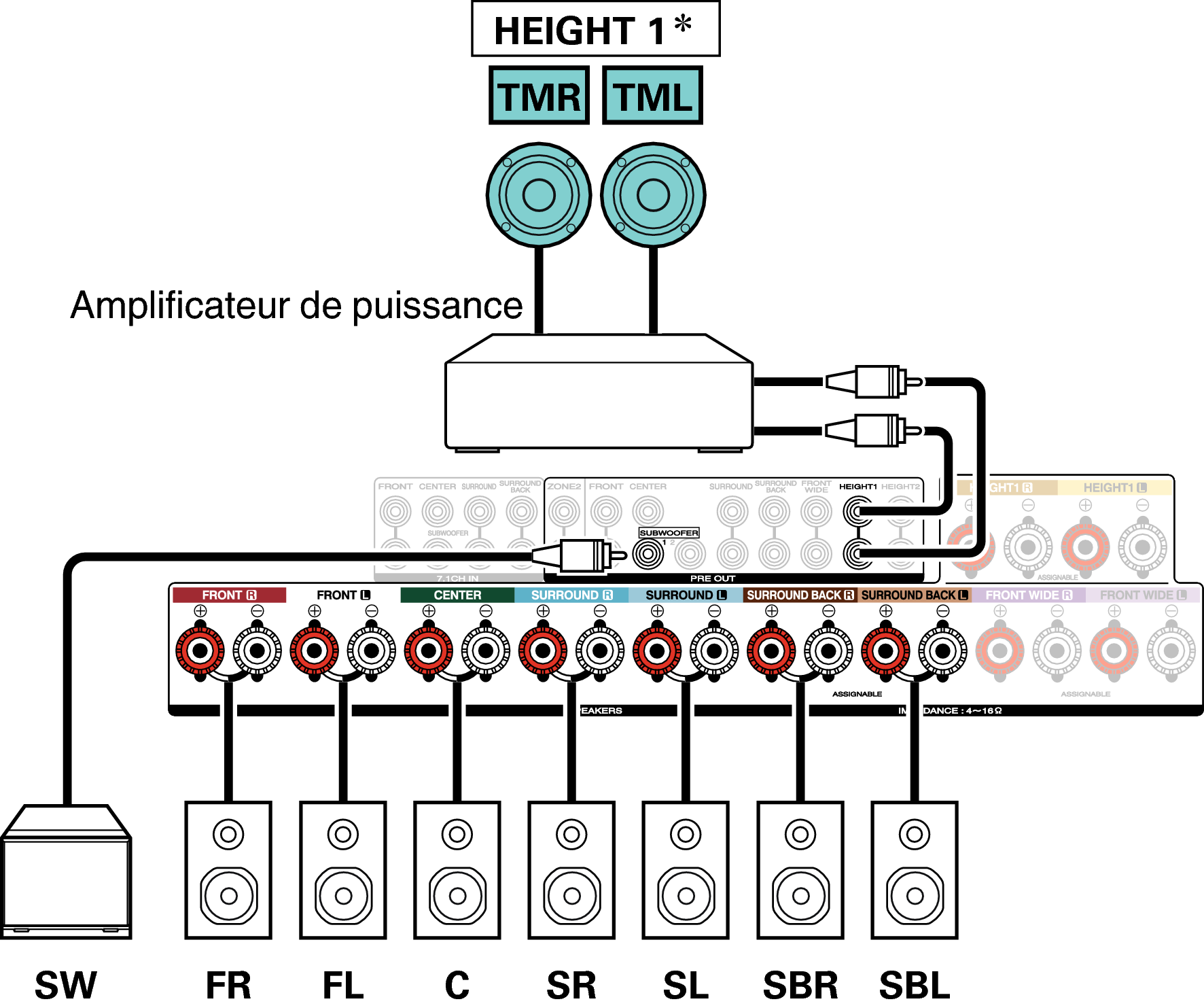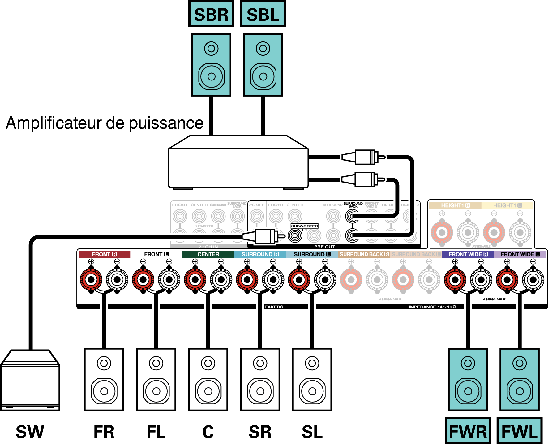 Exemple de connexion avec utilisation d’enceintes surround arrière et larges avant