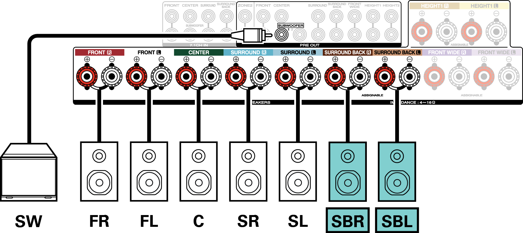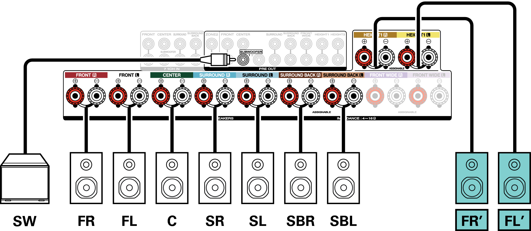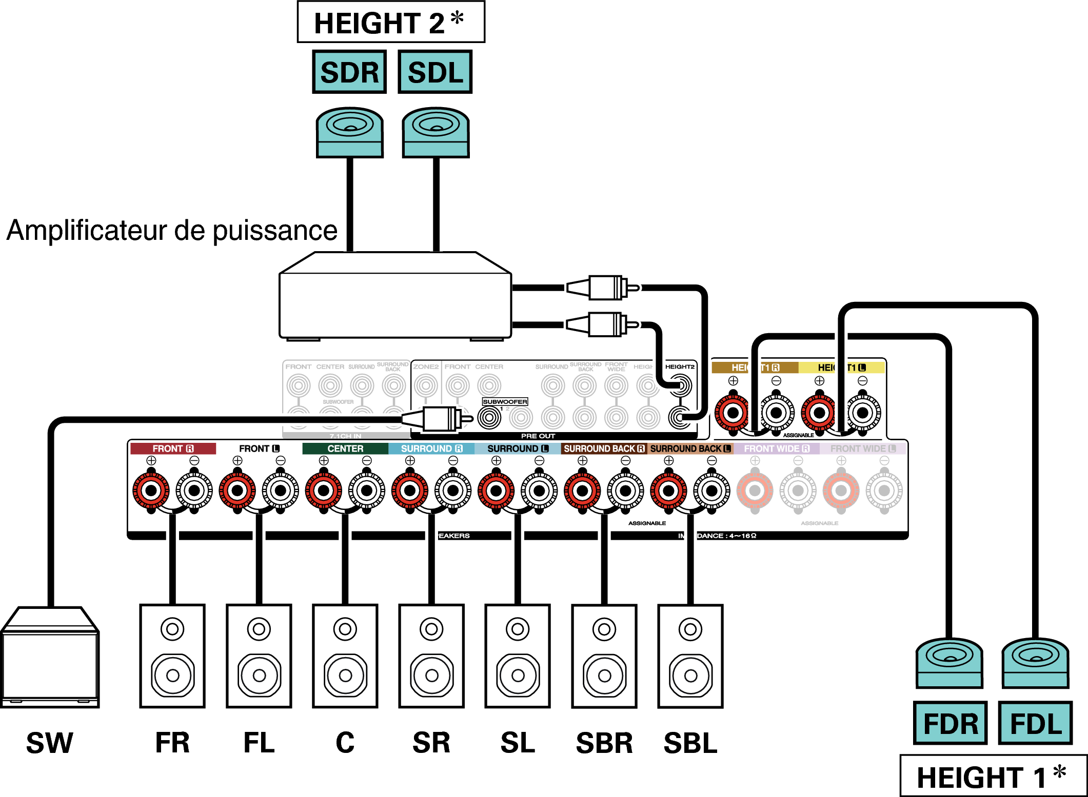 Exemple de connexion avec utilisation d’enceintes surround arrière et larges avant
