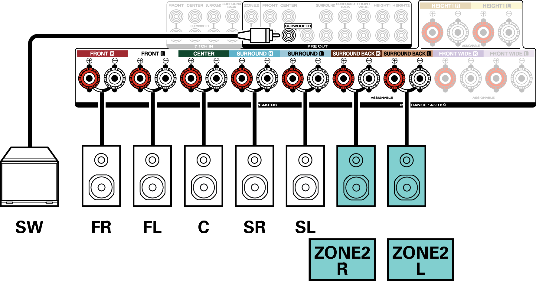 Vous pouvez connecter des haut-parleurs jusqu’à 11 canaux pour la MAIN ZONE. Lorsque vous connectez les enceintes pour 8 canaux ou plus, la sortie des enceintes change automatiquement en fonction du signal d’entrée et du mode audio.