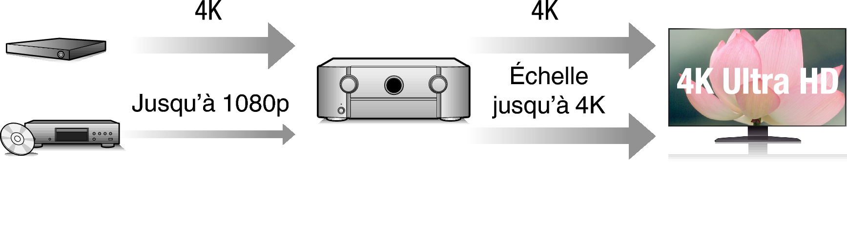 Lorsque 4K Ultra HD (High Definition) est utilisé, une vitesse d’entrée/sortie de 60 images par seconde (60p) est obtenue pour les signaux vidéo. Lorsque vous êtes connecté à l’entrée d’un signal vidéo d’une TV compatible 4K Ultra HD et 60p, vous pouvez profiter du sens du réalisme disponible uniquement à partir d’images en haute définition, même en visualisant une vidéo en mouvement rapide.