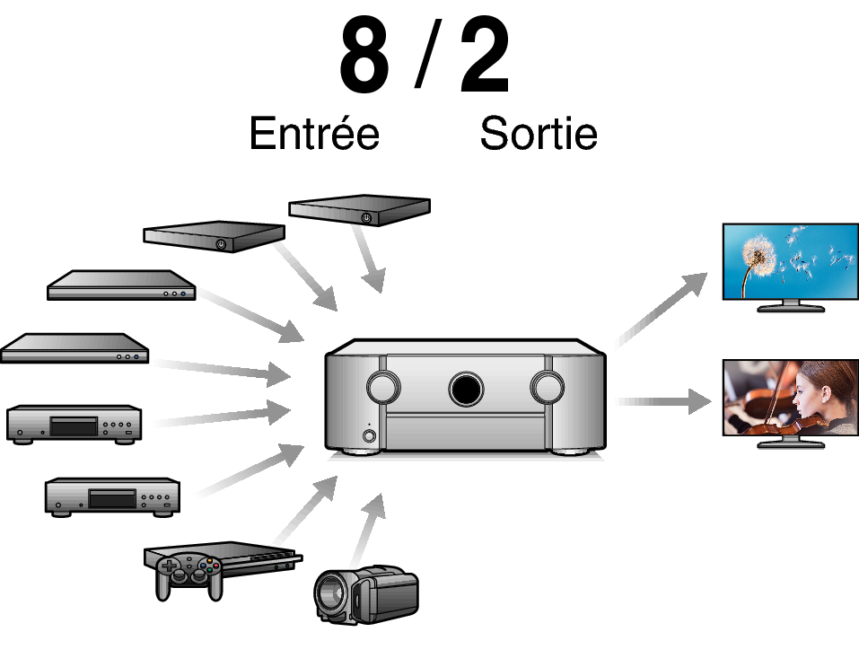 Les connexions HDMI permettent la connexion à divers appareils AV numériques (8 entrées, 2 sorties)