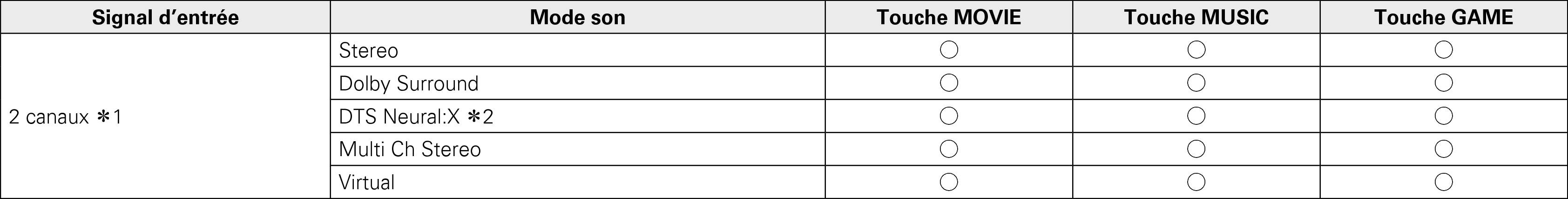 Ce mode lit l’audio stéréo 2 canaux sans traitement de son surround supplémentaire. Le son est émis par les enceintes avant gauche et droite et par le subwoofer, s’il est connecté. Lorsque les signaux multi-canaux sont utilisés, ils sont mélangés à l’audio 2 canaux et lus sans traitement de son surround supplémentaire. |