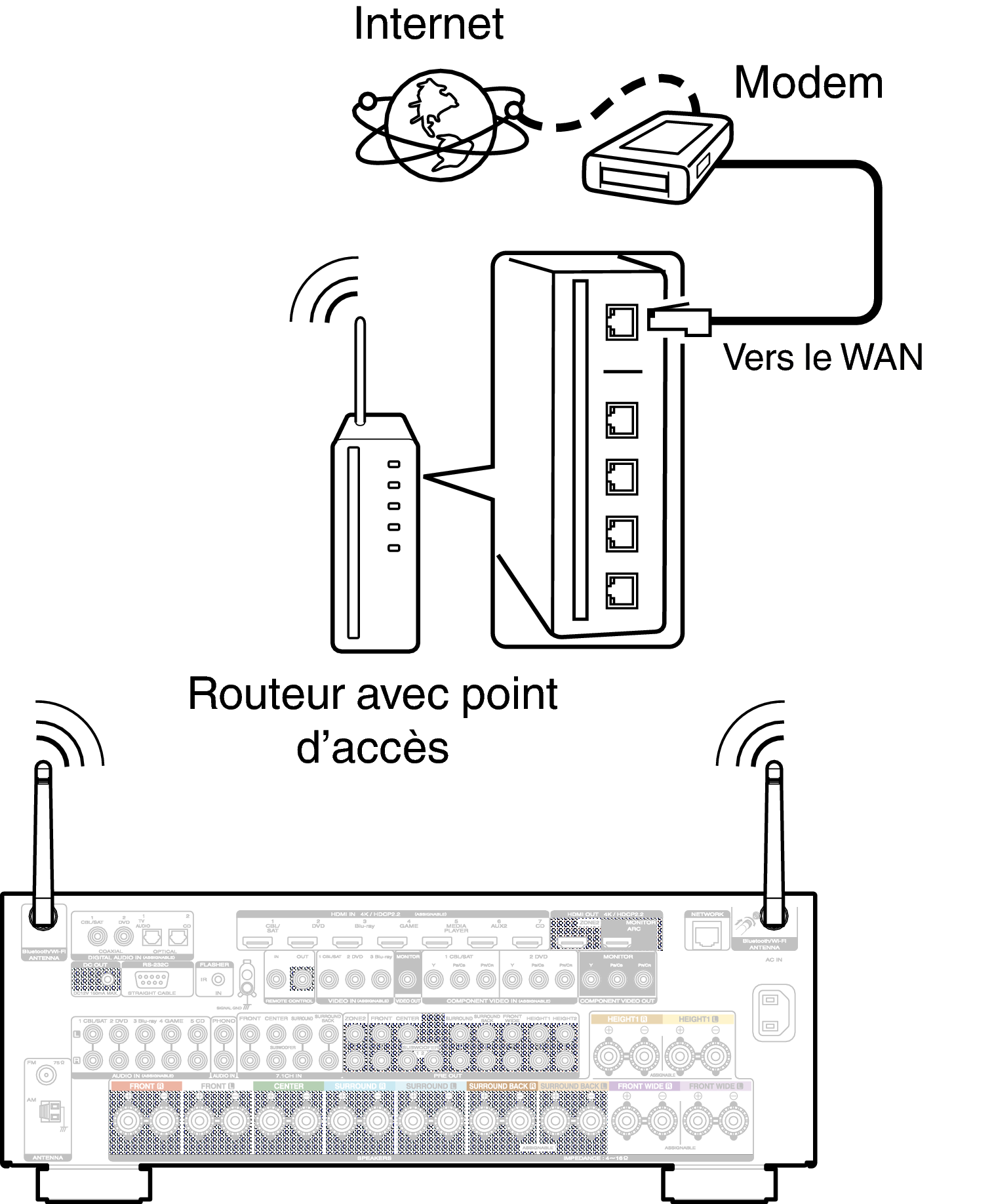 Voir “Config. Wi-Fi” pour savoir comment connecter à un routeur de réseau local sans fil. lien