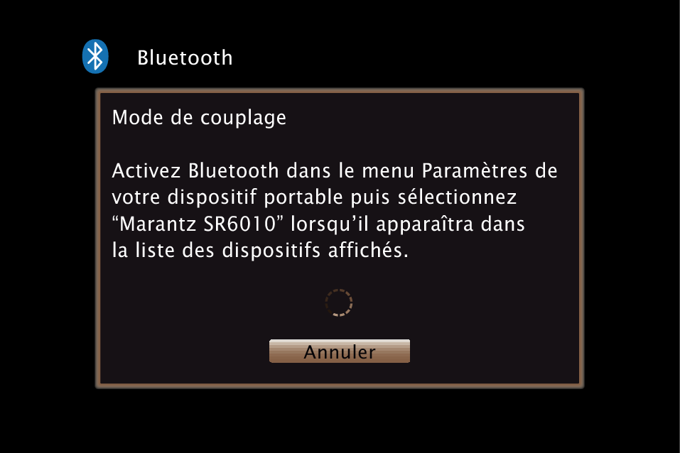 Lors de la prochaine commutation de la source d’entrée sur le Bluetooth, cet appareil se connectera automatiquement au dernier périphérique Bluetooth connecté.