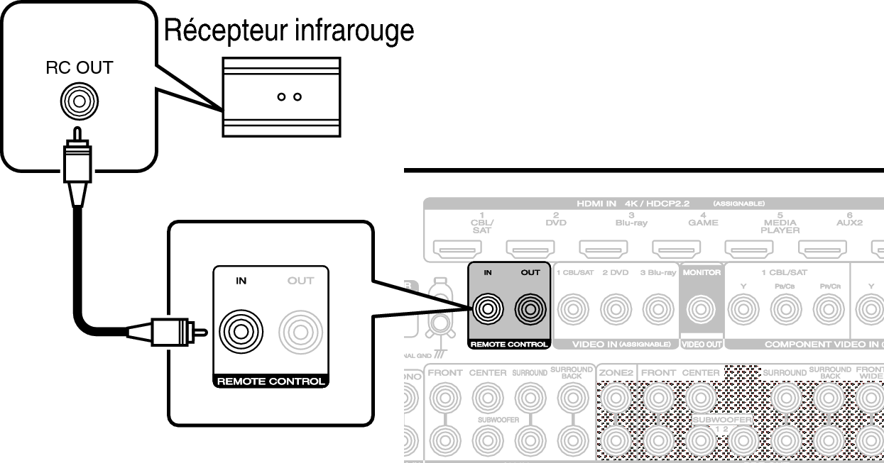 Vous pouvez connecter un récepteur infrarouge externe aux bornes REMOTE CONTROL pour effectuer des opérations sur cet appareil à l’aide de la télécommande fournie sans contact visuel. Ceci peut être nécessaire si l’appareil est caché derrière un placard ou dans un coin, si bien que vous ne pouvez pas pointer directement vers l’appareil avec la télécommande.