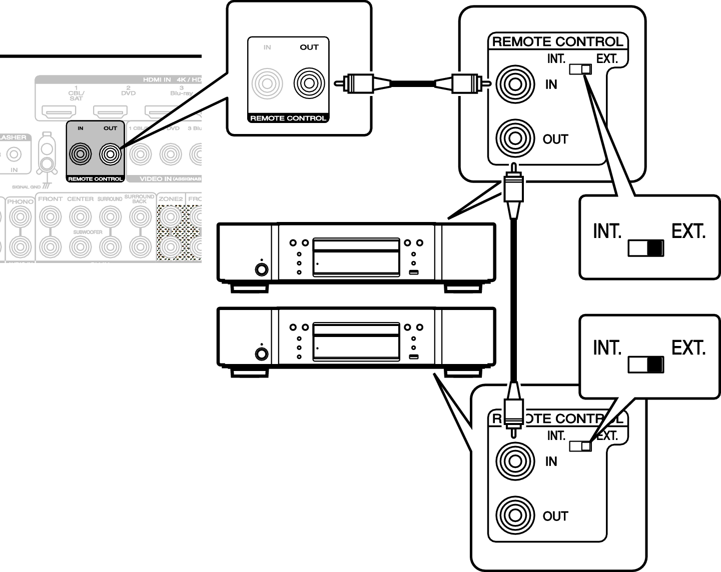 Si vous utilisez un appareil Marantz autre que cet appareil compatible avec la connexion à distance, vous pouvez transmettre des signaux de télécommande en connectant simplement l’appareil à la borne REMOTE CONTROL IN/OUT au moyen d’un câble monaural.