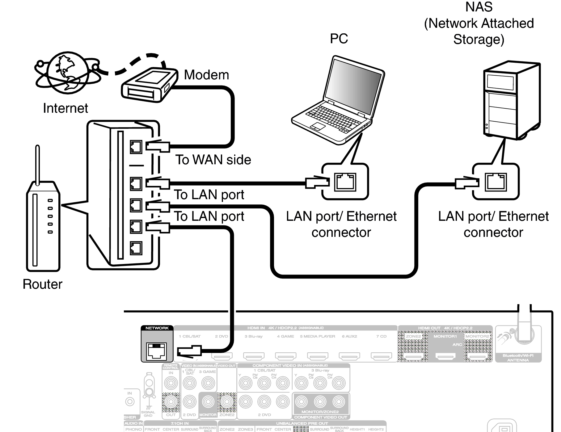 To make connections via wired LAN, use a LAN cable to connect the router to this unit as shown in the figure below.