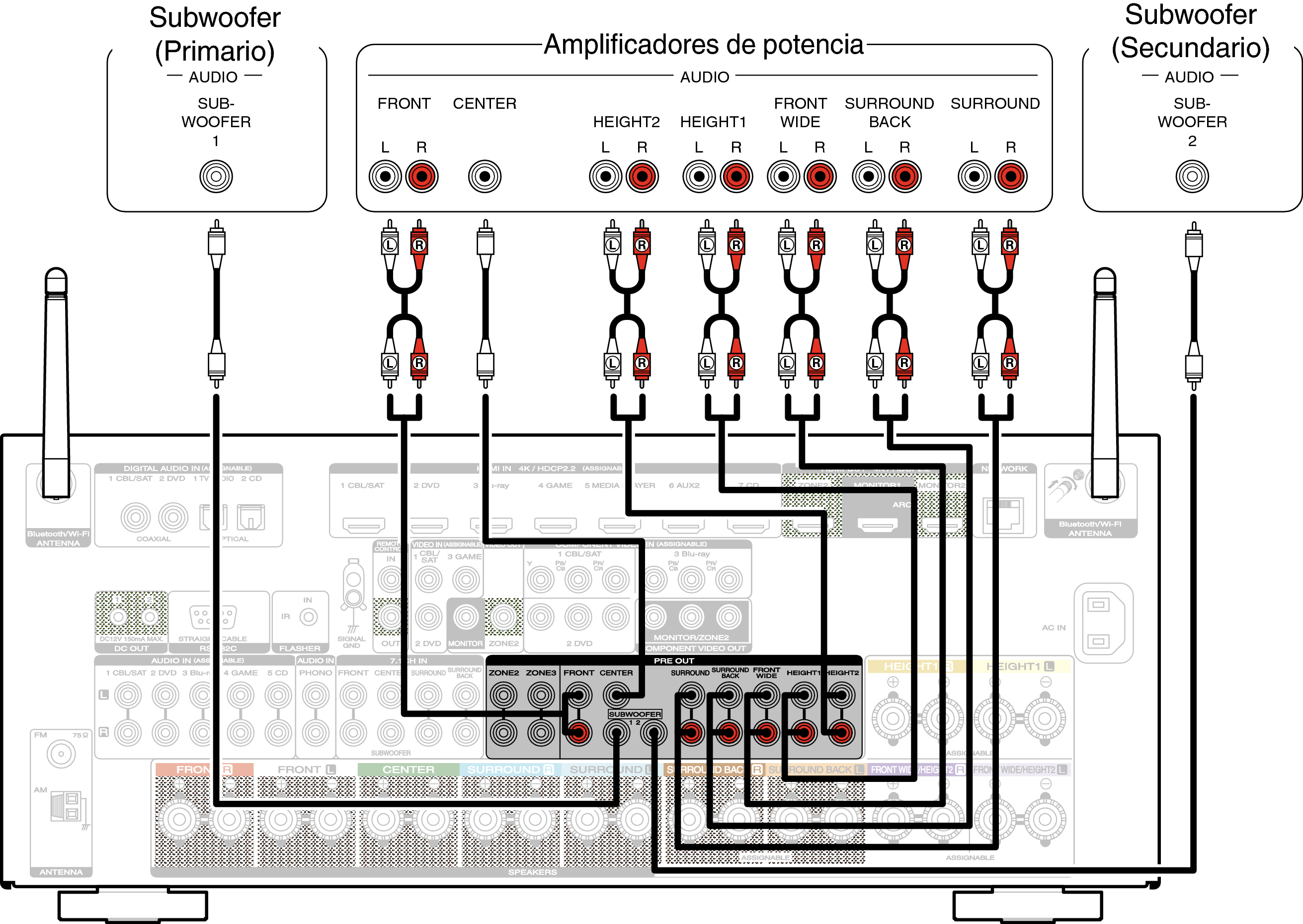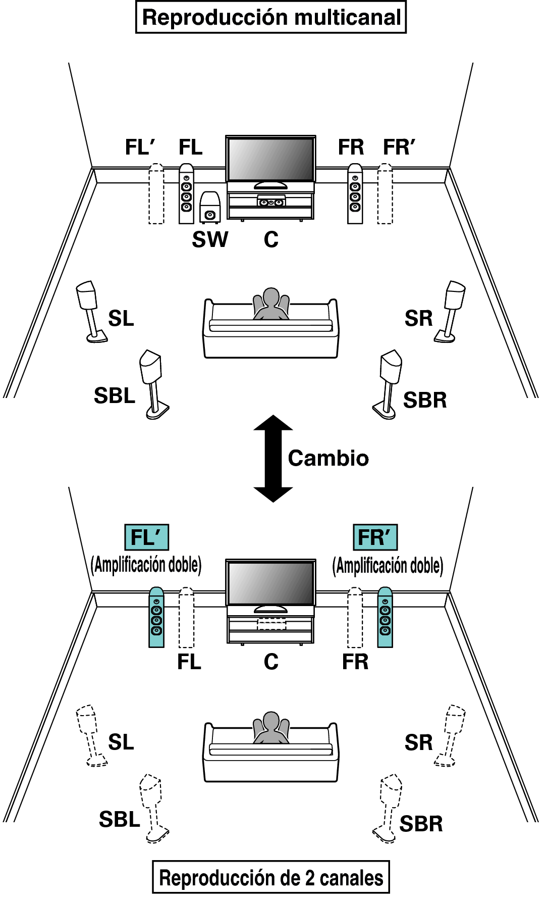 Reproducción exclusiva de 7.1 canales + altavoces de reproducción de 2 canales (conexión de amplificación doble)