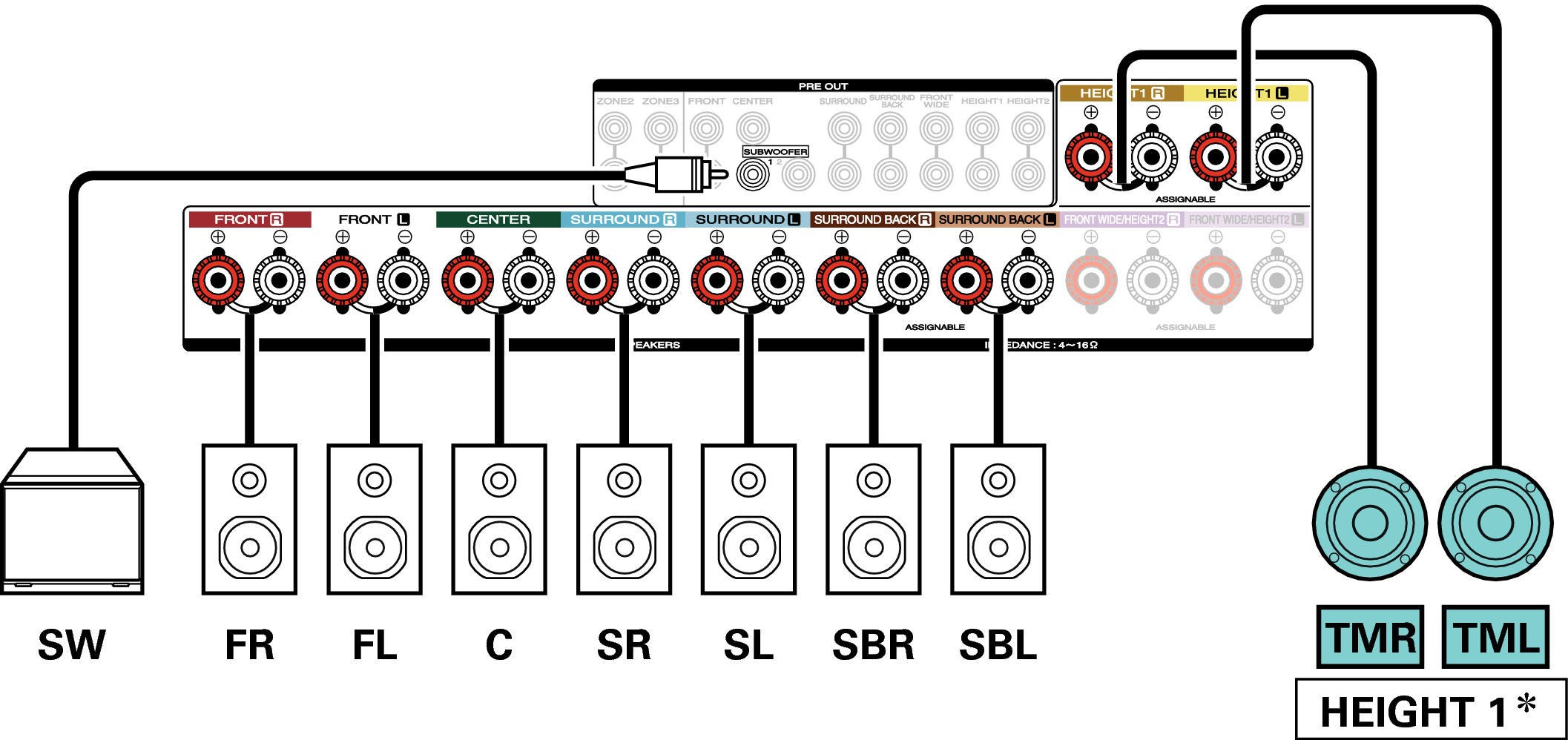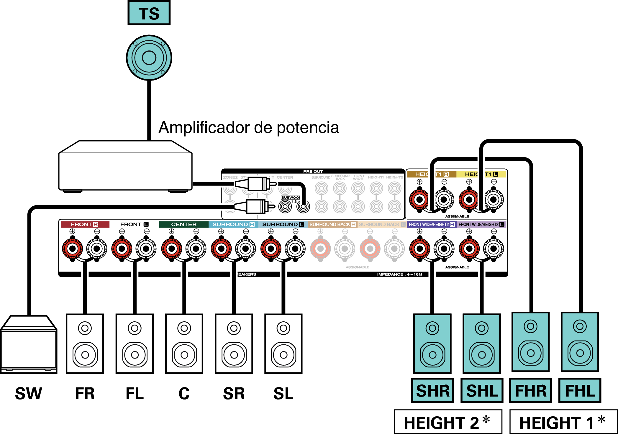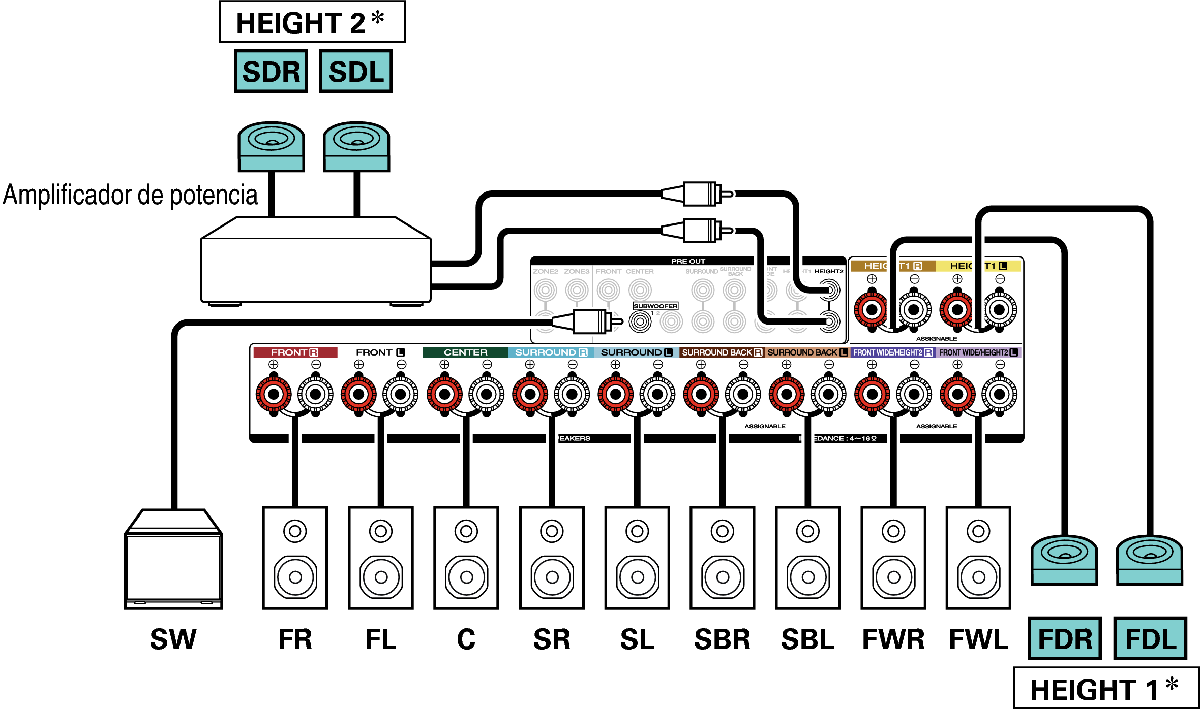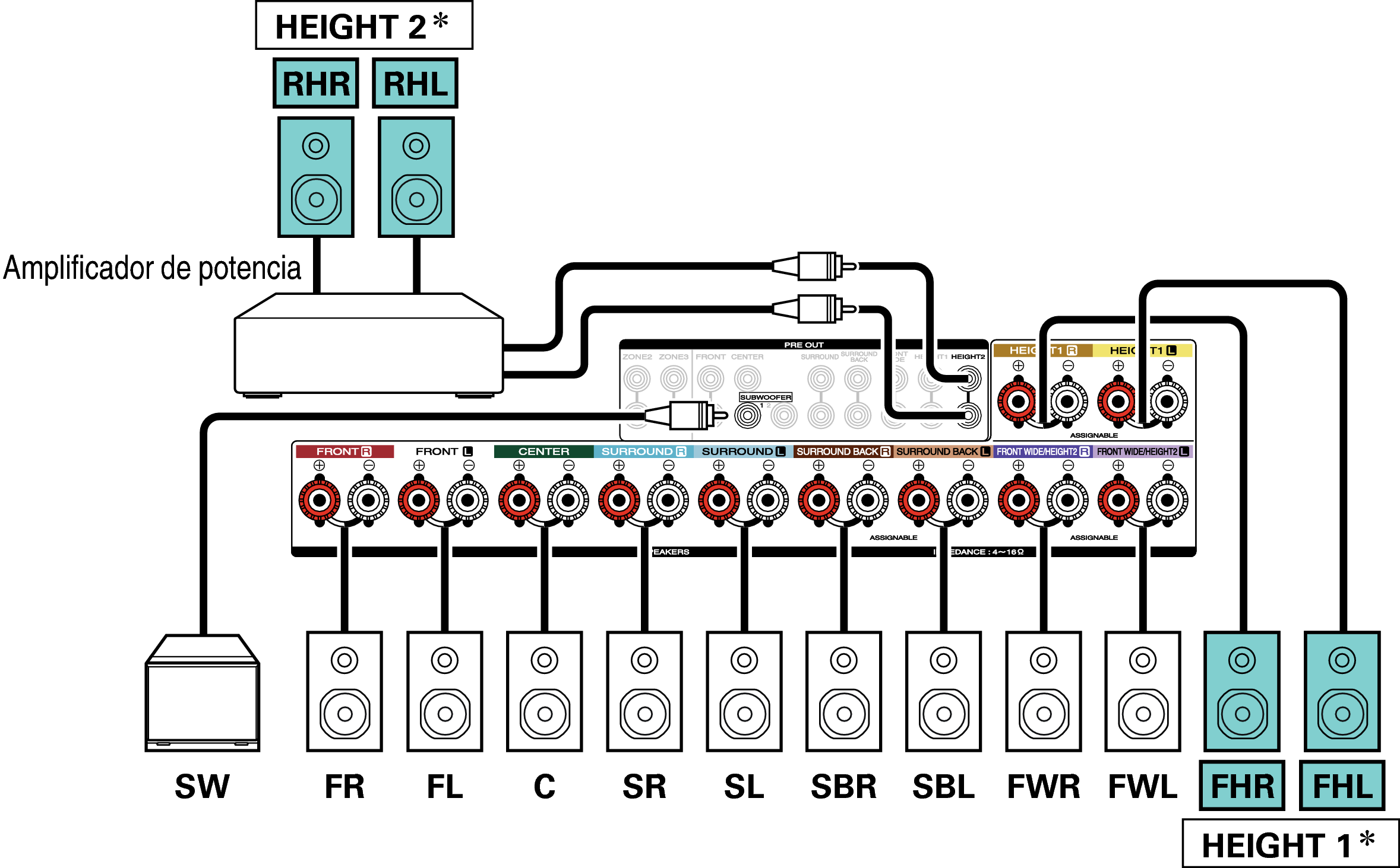 Los altavoces de altura, altavoces de techo y altavoces Dolby Atmos Enabled se pueden conectar a los terminales de altavoz HEIGHT1. Establezca el altavoz que se vaya a conectar mediante la opción “Altura” - “Distribución” del menú. enlace