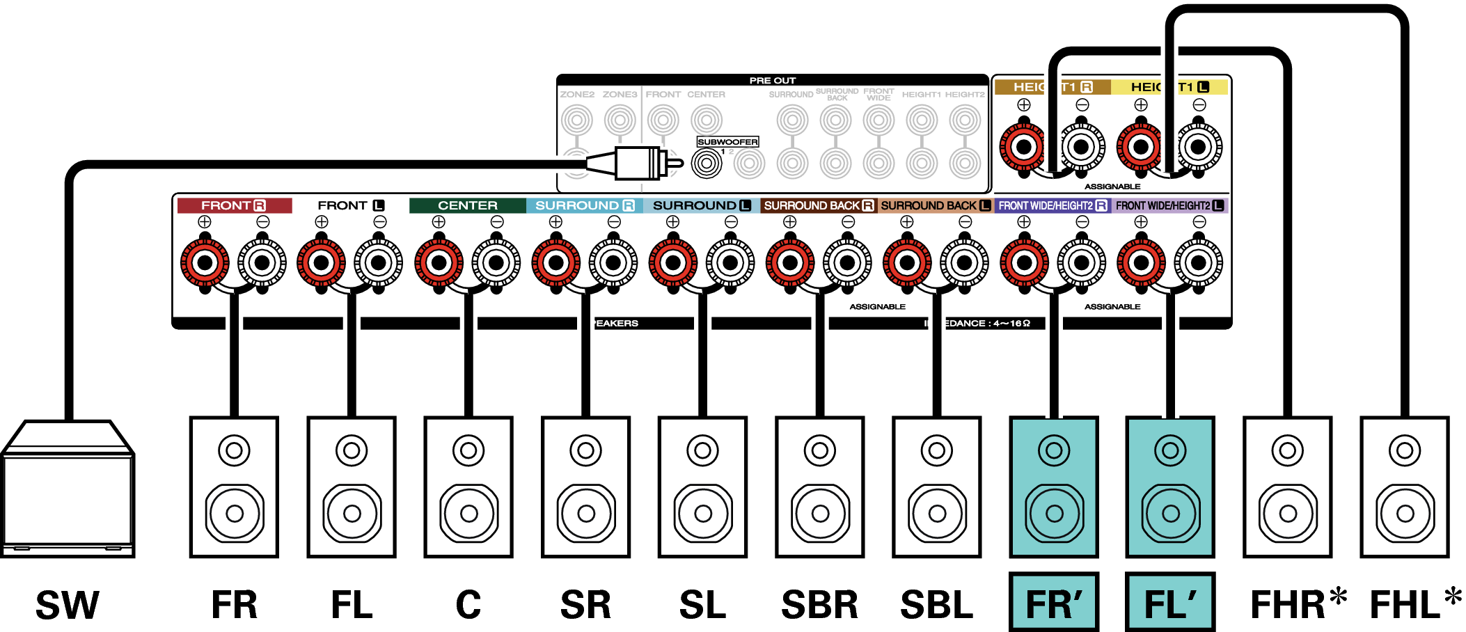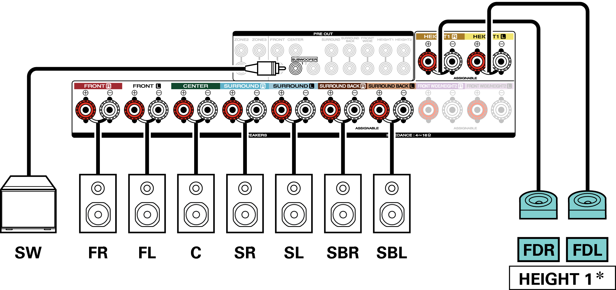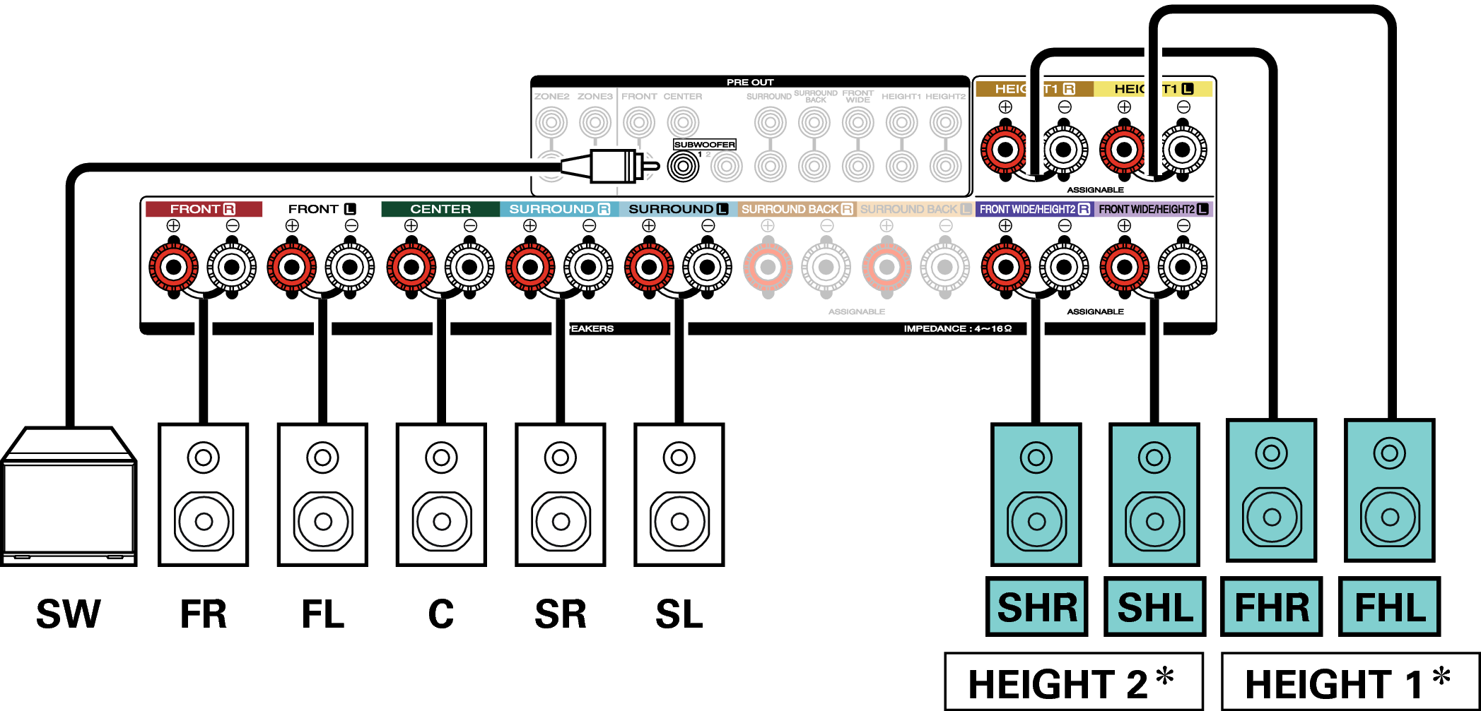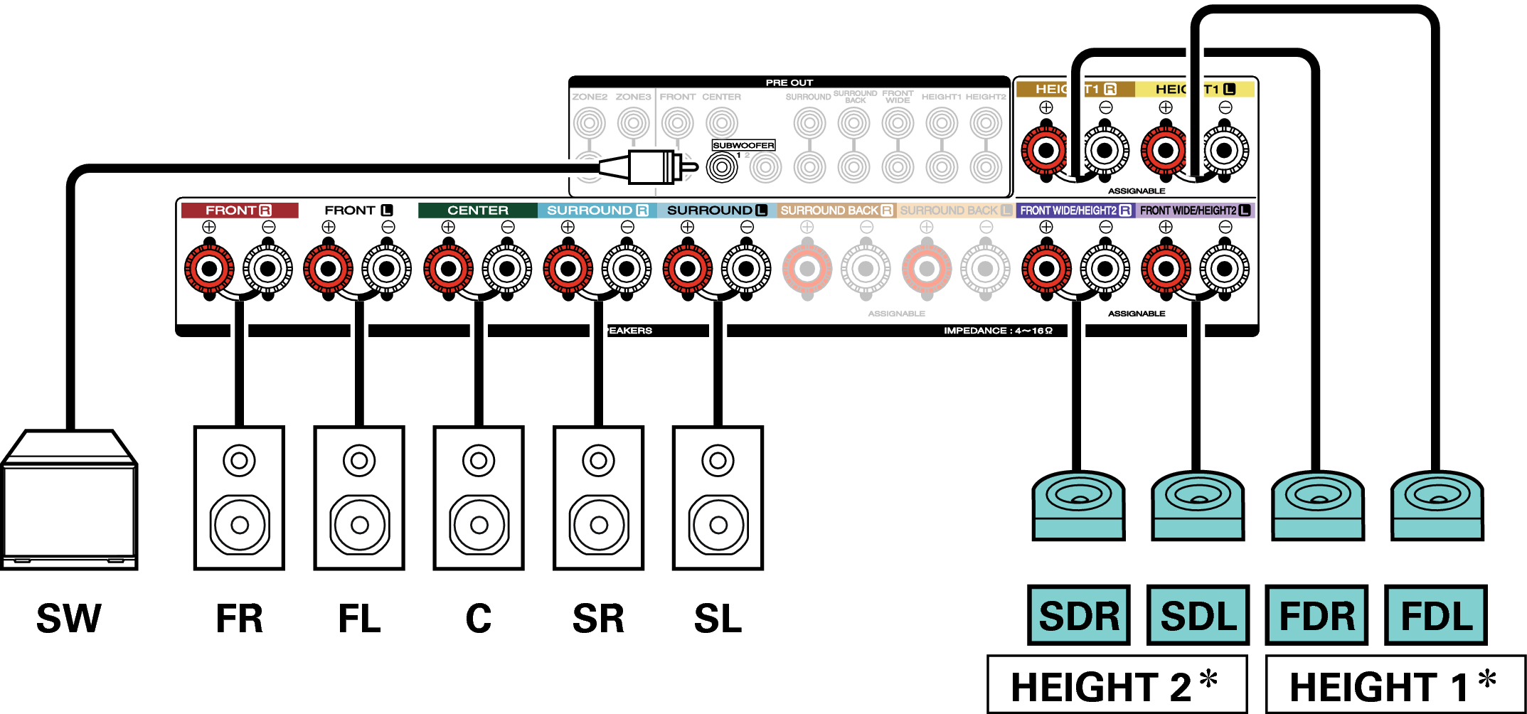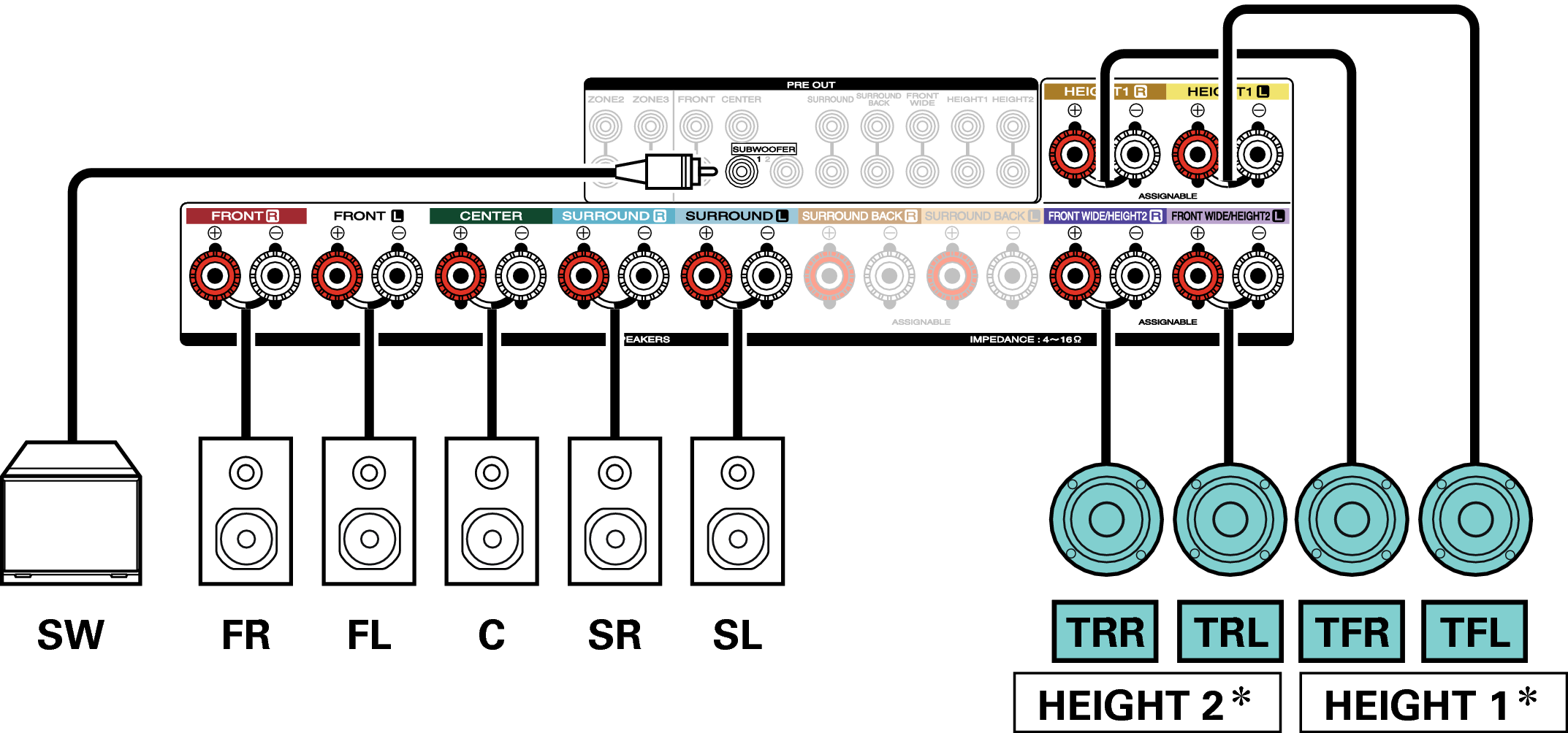 Los altavoces de altura, altavoces de techo y altavoces Dolby Atmos Enabled se pueden conectar a los terminales de altavoz HEIGHT1. Establezca el altavoz que se vaya a conectar mediante la opción “Altura” - “Distribución” del menú. enlace