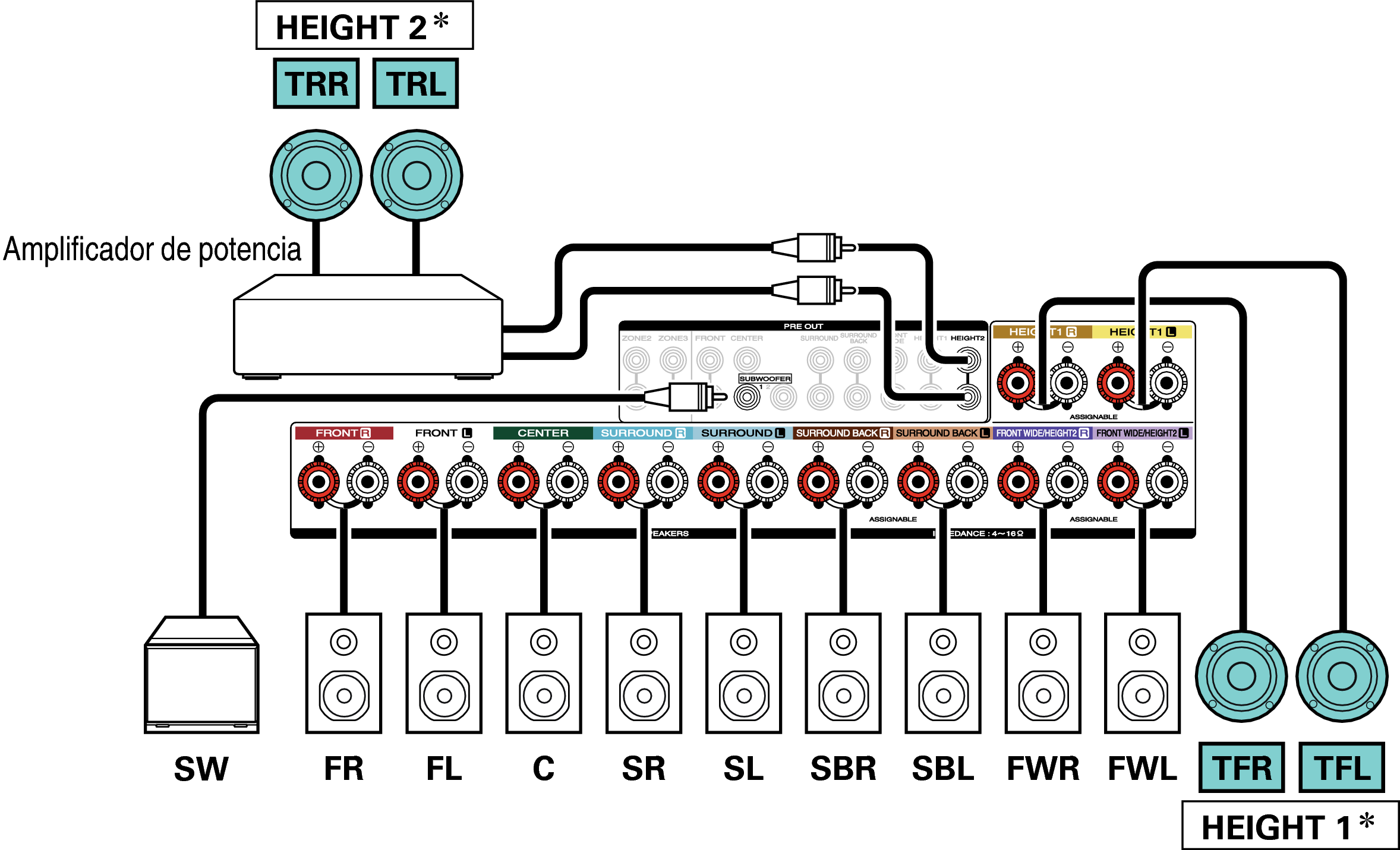 Se pueden conectar los altavoces de altura trasero en lugar de los altavoces de altura frontal. En este caso, establezca los altavoces de altura que se vayan a conectar en la opción “Altura” - “Distribución” del menú. enlace
