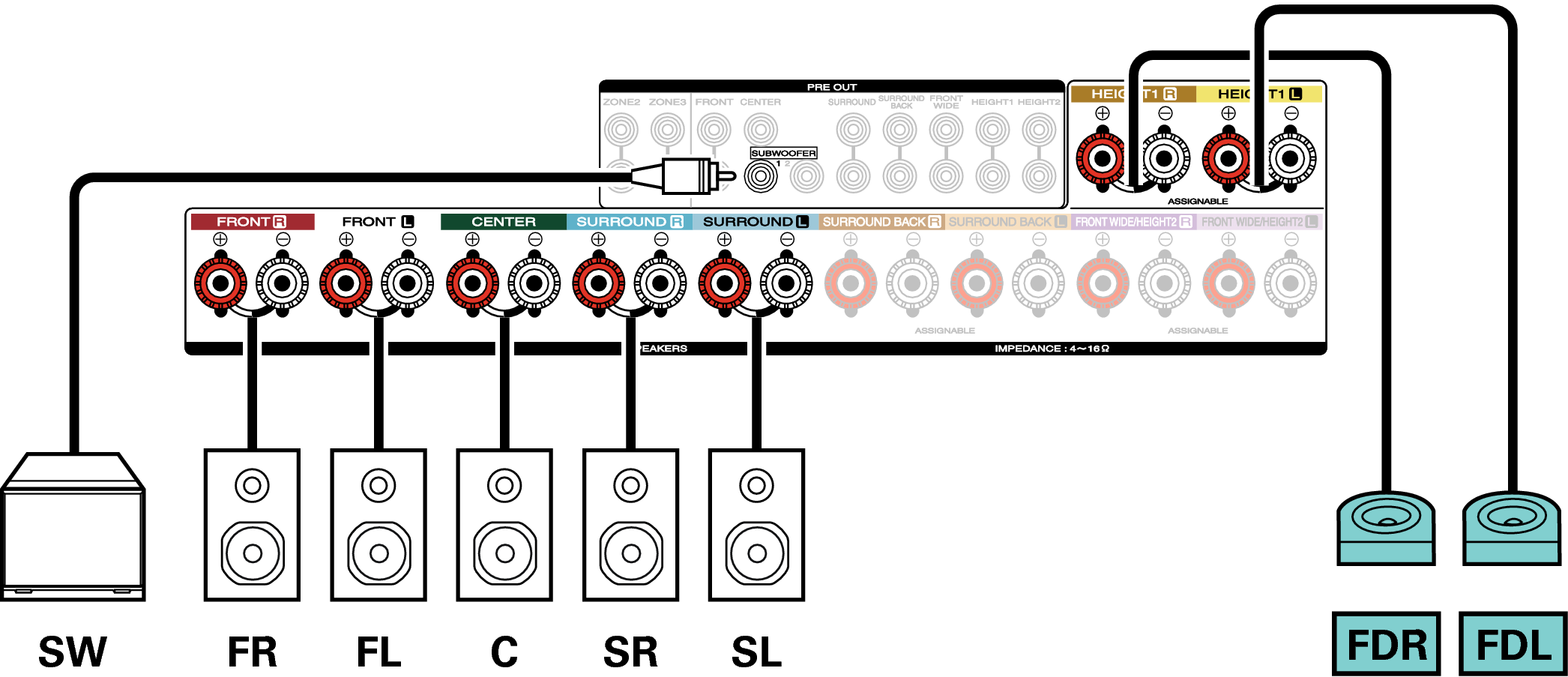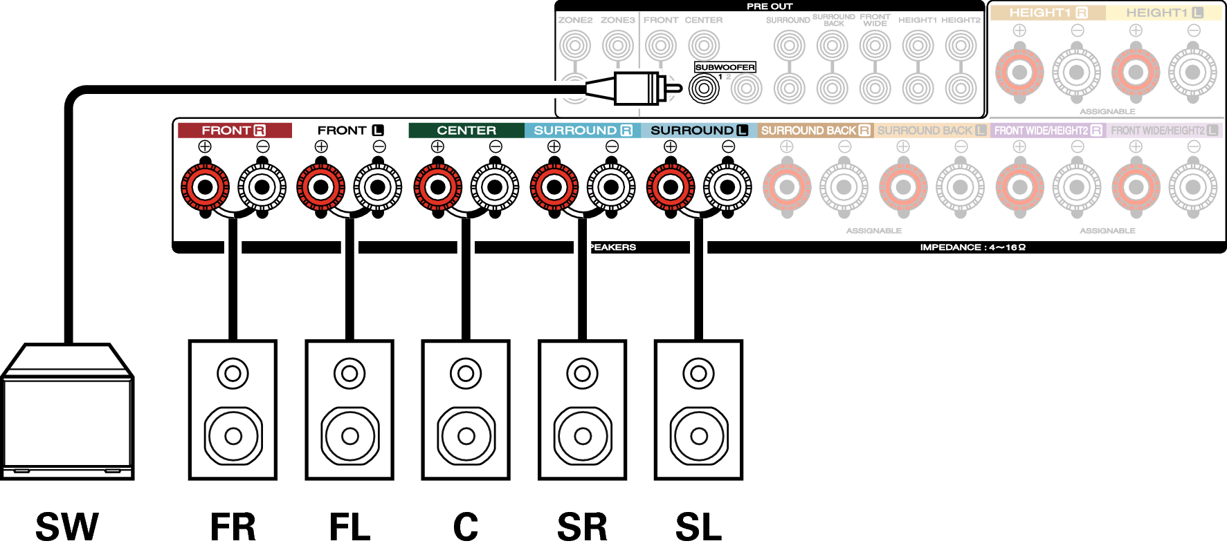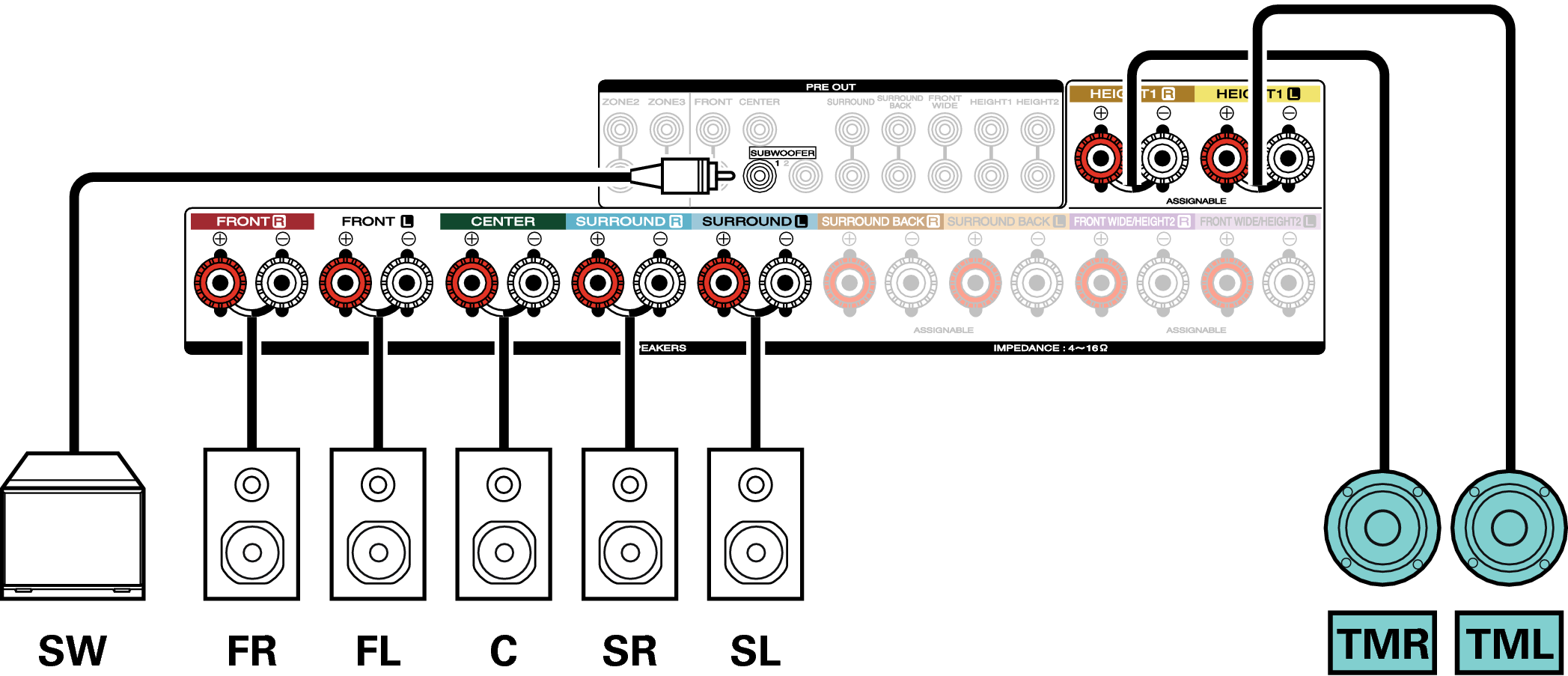 Si utiliza un solo altavoz surround trasero, conéctelo al terminal del canal izquierdo (L).