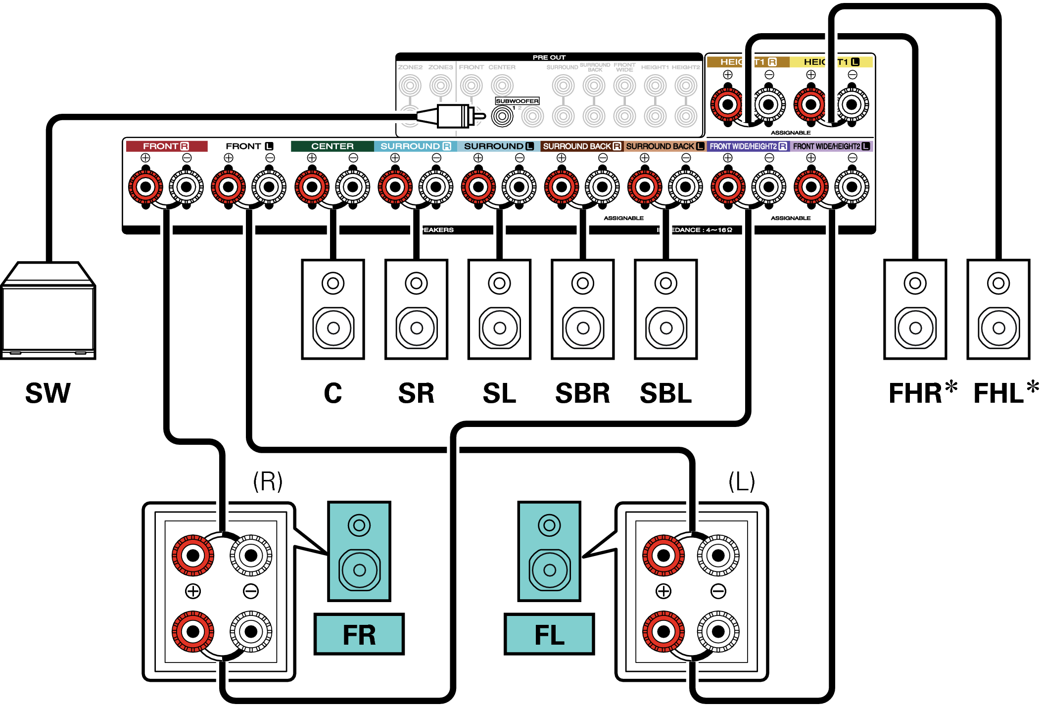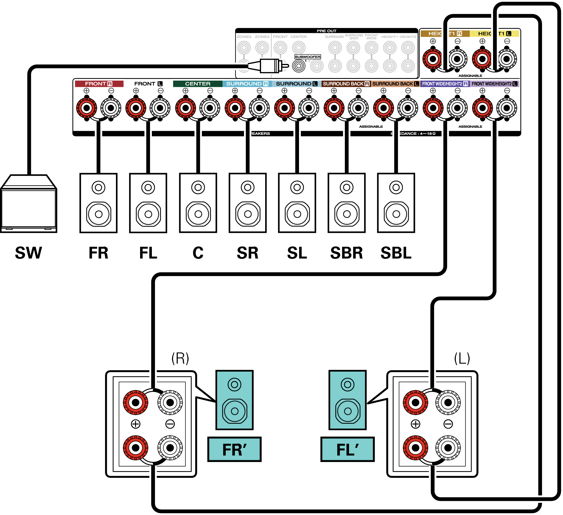 Ejemplo de conexión cuando se utilizan altavoces surround trasero y ancho delantero
