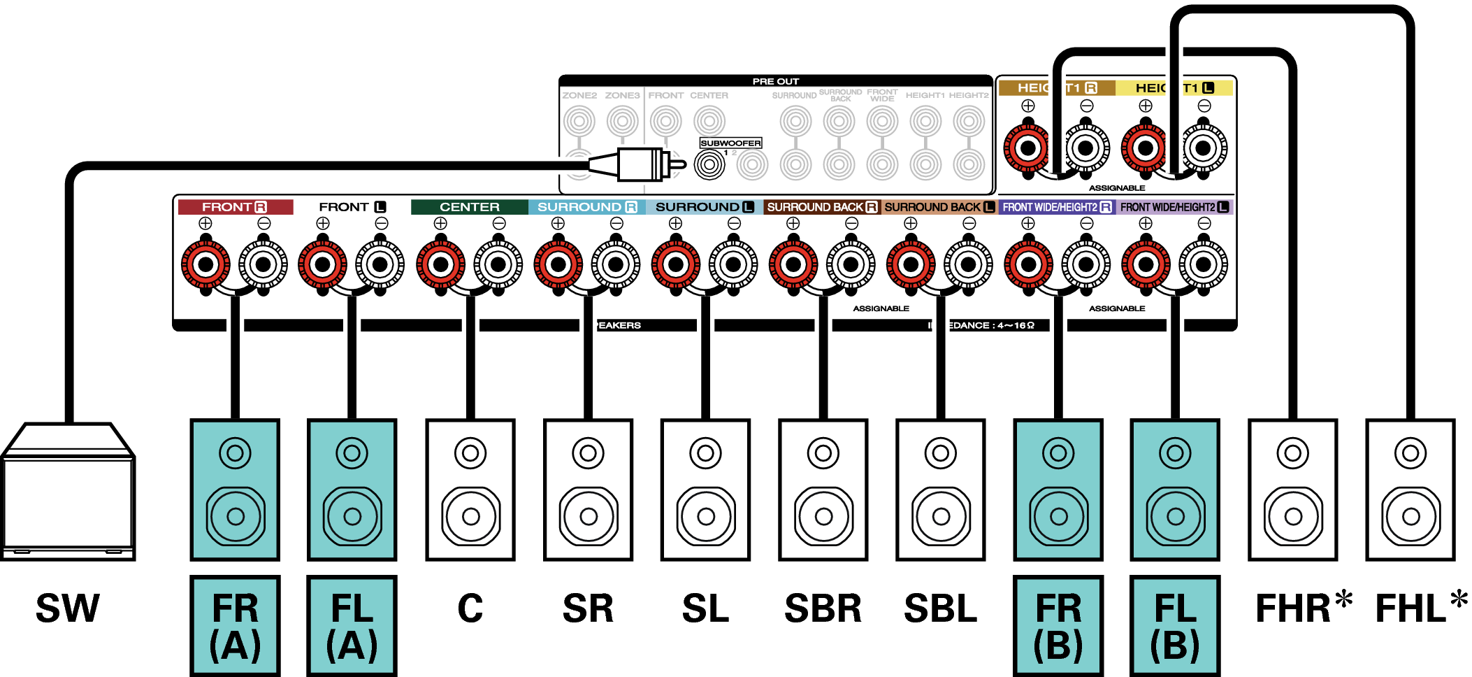Podrá conectar los altavoces utilizados exclusivamente para la reproducción de 2 canales, los cuales se usan en los modos directo y estéreo, y los altavoces utilizados exclusivamente para la reproducción de 9.1 multicanales. Los altavoces que se usan exclusivamente para la reproducción multicanal y los altavoces que se utilizan exclusivamente para la reproducción de 2 canales cambian de forma automática en función del modo de sonido.