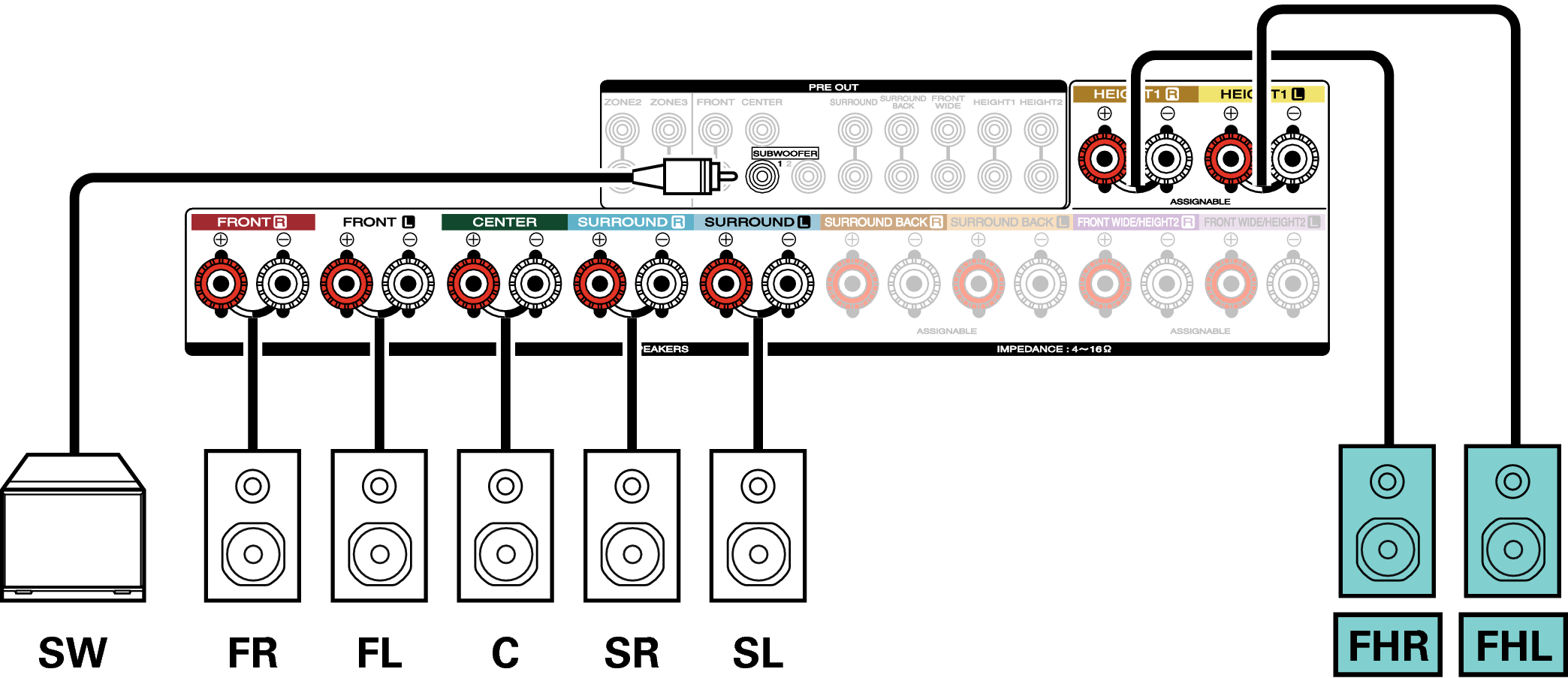 Consulte el ejemplo de conexión para Ejemplo de conexión para el sistema Auro-3D de 9.1 canalesenlace cuando vaya a reproducir Auro-3D con un sistema de 9.1 canales utilizando el sistema básico de 5.1 canales y altavoces de altura frontal y altura surround.